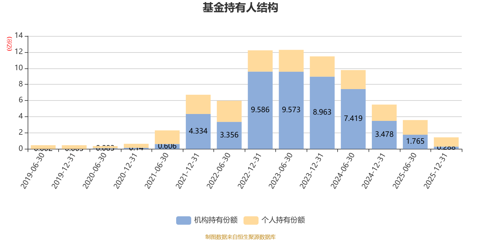 截至2025年12月31日,基金持有人共计1.68万户,合计持有1.44亿份。其中管理人员工持有597.96万份,占比4.15%,机构持有份额占比20.00%,个人投资者占比80.00%。