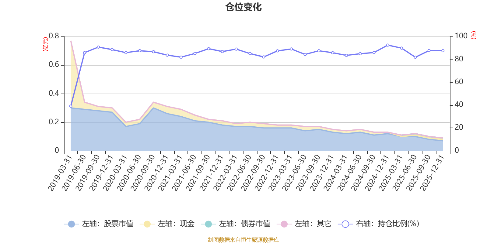 据定期报告数据统计,近三年平均股票仓位为86.67%,同类平均为72.57%。2024年末基金达到92.43%的最高仓位,2019年一季度末最低,为39.05%。