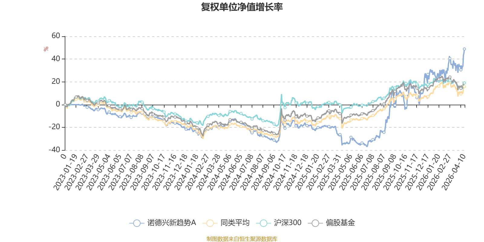截至4月10日,诺德兴新趋势A近三个月复权单位净值增长率为18.89%,位于同类可比基金20/689;近半年复权单位净值增长率为44.42%,位于同类可比基金13/689;近一年复权单位净值增长率为127.14%,位于同类可比基金14/685;近三年复权单位净值增长率为53.66%,位于同类可比基金43/417。