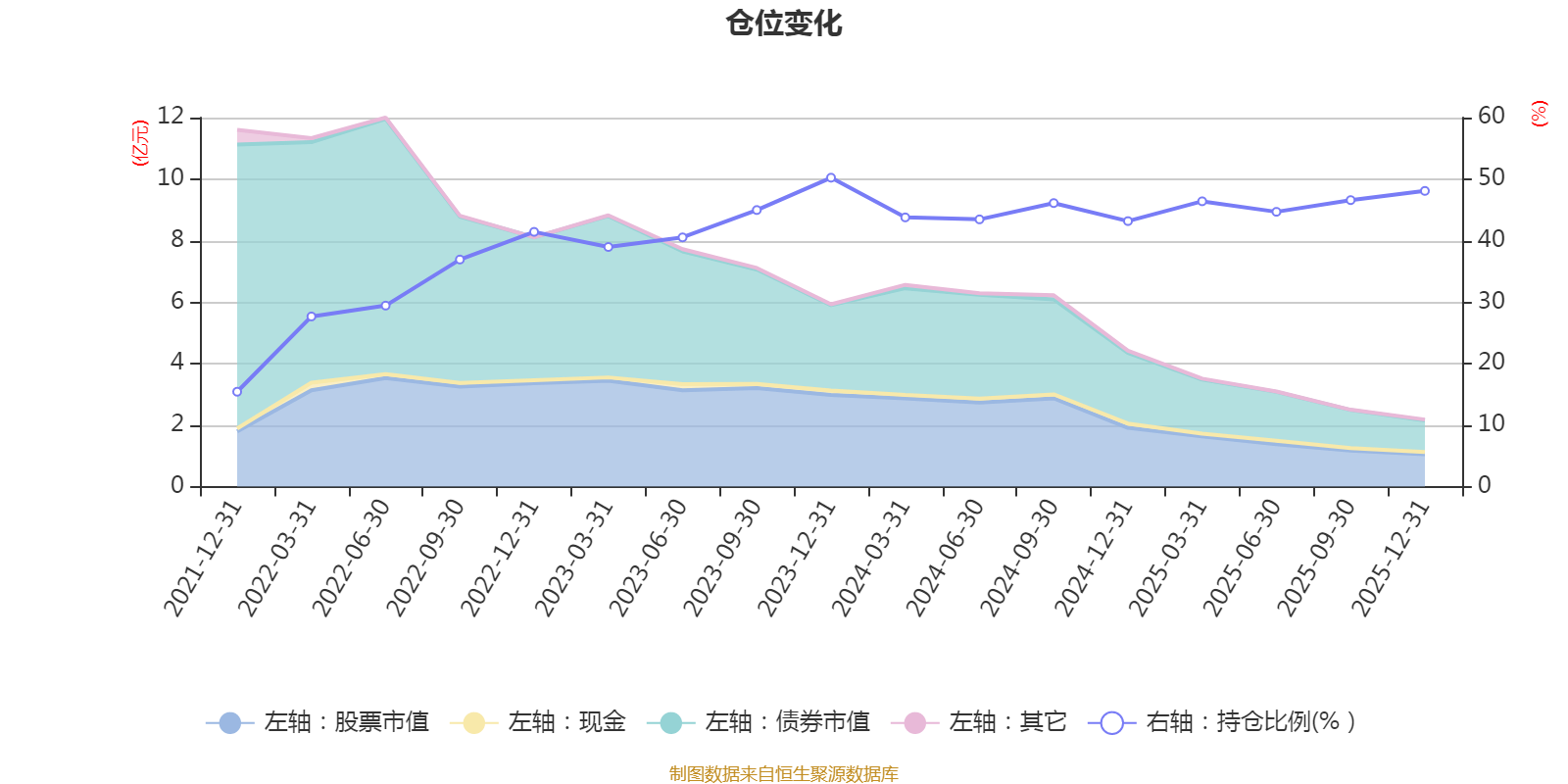 据定期报告数据统计,近三年平均股票仓位为44.74%,同类平均为67.52%。2023年末基金达到50.23%的最高仓位,2021年末最低,为15.42%。