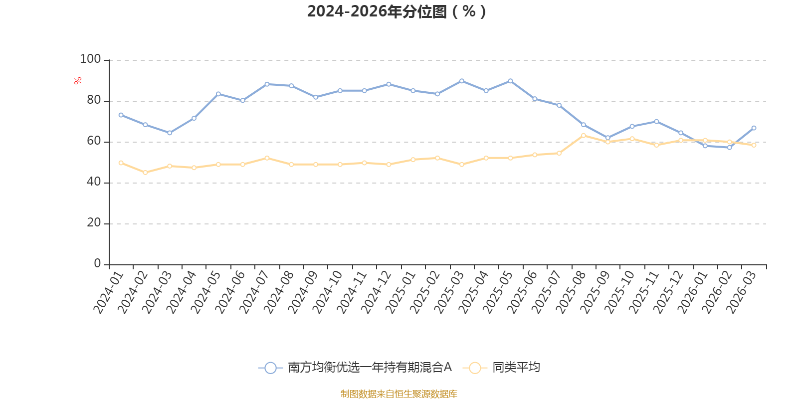 通过所选区间该基金净值增长率分位图,可以观察该基金与同类基金业绩比较情况。图为坐标原点到区间内某时点的净值增长率在同类基金中的分位数。