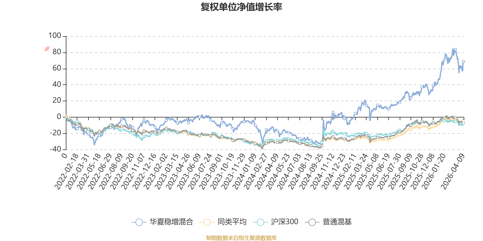 截至4月9日,华夏稳增混合近三个月复权单位净值增长率为4.18%,位于同类可比基金24/134;近半年复权单位净值增长率为27.62%,位于同类可比基金4/134;近一年复权单位净值增长率为67.67%,位于同类可比基金10/134;近三年复权单位净值增长率为75.45%,位于同类可比基金4/126。