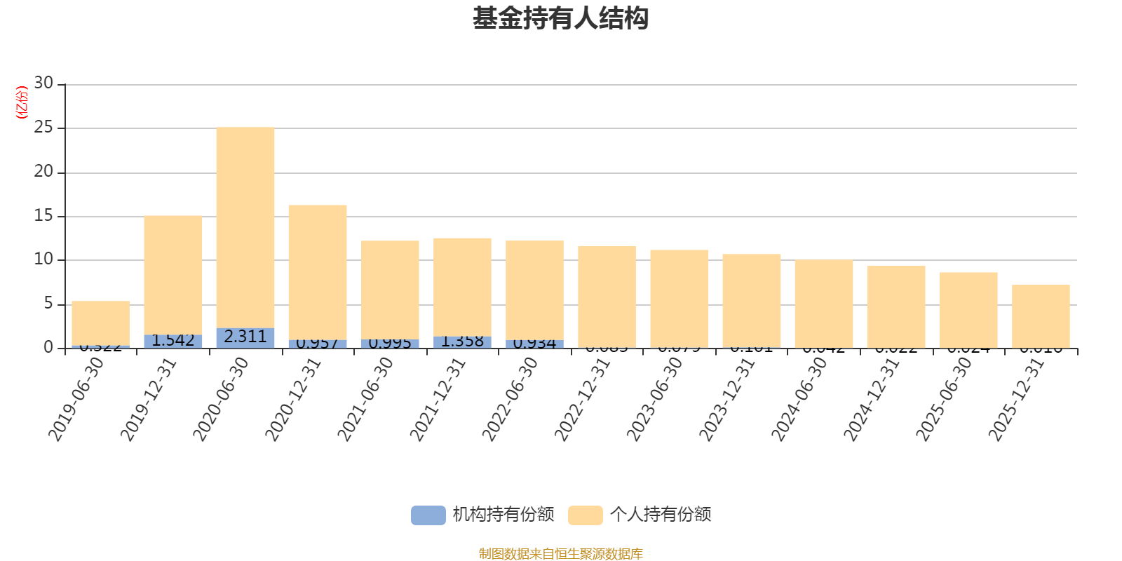 截至2025年12月31日,基金持有人共计18.58万户,合计持有7.22亿份。其中管理人员工持有47.57万份,占比0.07%,机构持有份额占比0.23%,个人投资者占比99.77%。