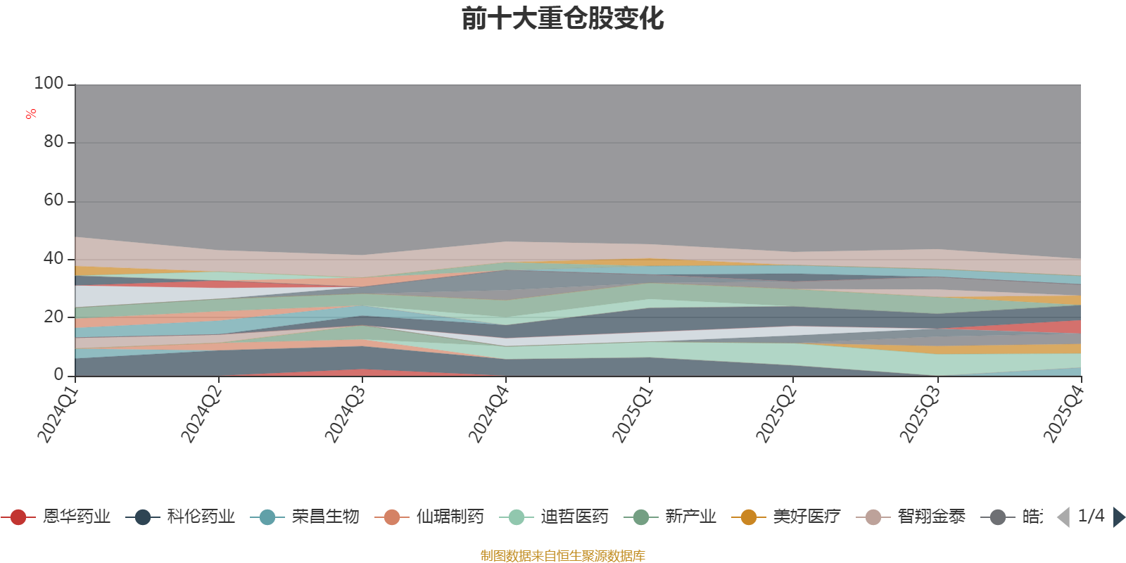 截至2025年末,基金十大重仓股分别是恒瑞医药、泽璟制药、迪哲医药、泰格医药、联影医疗、皓元医药、美好医疗、春立医疗、普瑞眼科、荣昌生物。