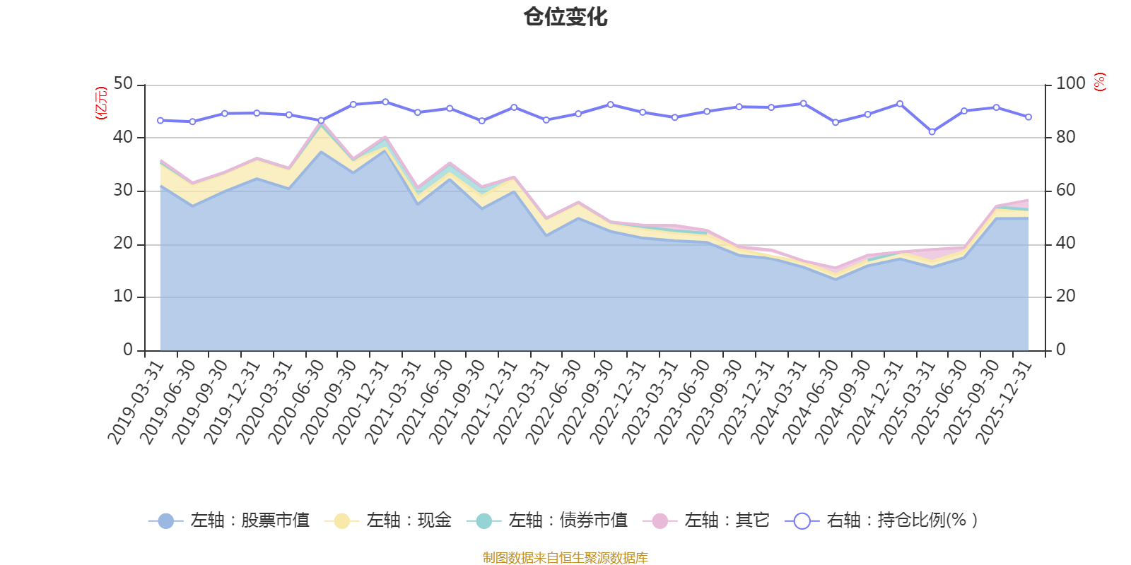 据定期报告数据统计,近三年平均股票仓位为89.44%,同类平均为86.9%。2020年末基金达到93.56%的最高仓位,2025年一季度末最低,为82.32%。