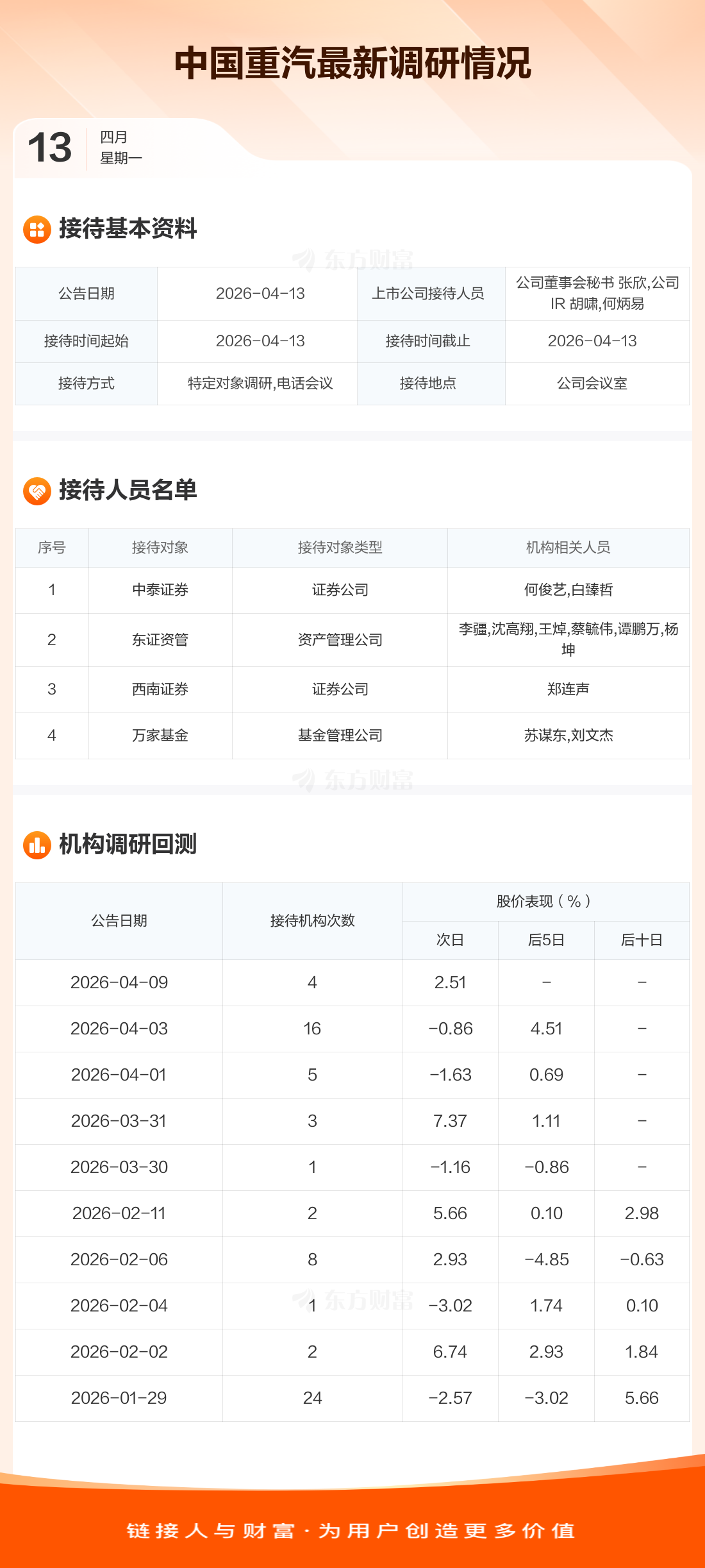 中国重汽4月13日公告称,4月13日接待中泰证券等4家机构调研。接待人员包括公司董事会秘书 张欣,公司IR 胡啸,何炳易。