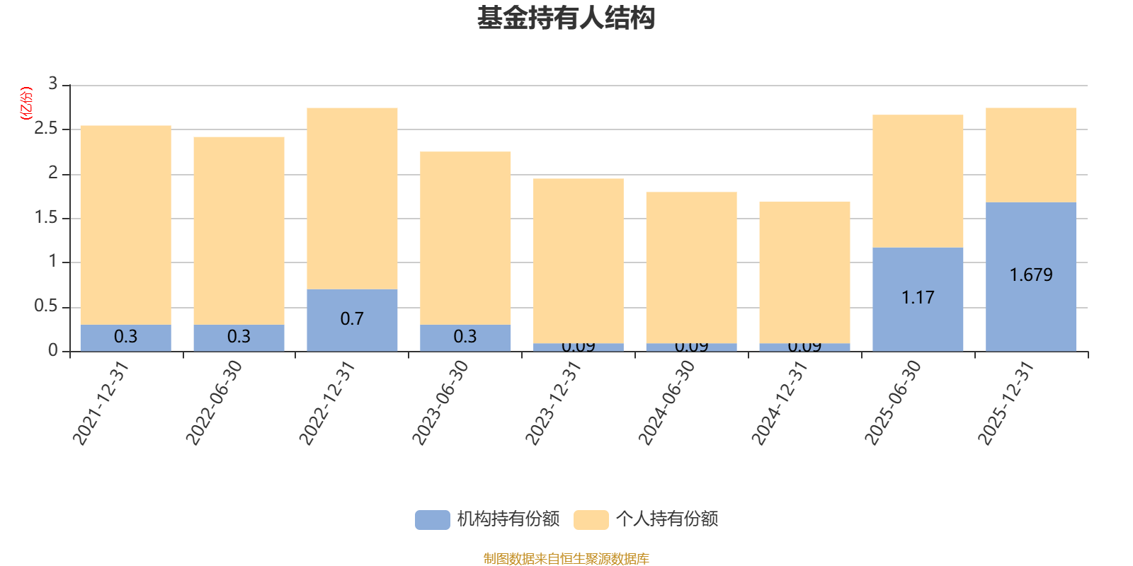 截至2025年12月31日,基金持有人共计1364户,合计持有2.74亿份。其中管理人员工持有100.53万份,占比0.37%,机构持有份额占比61.25%,个人投资者占比38.75%。