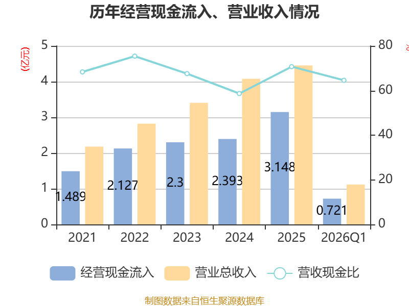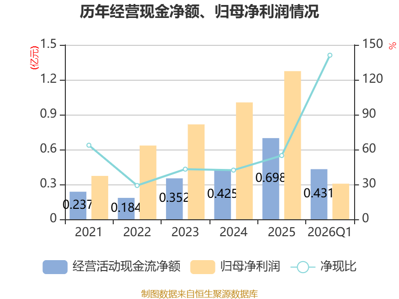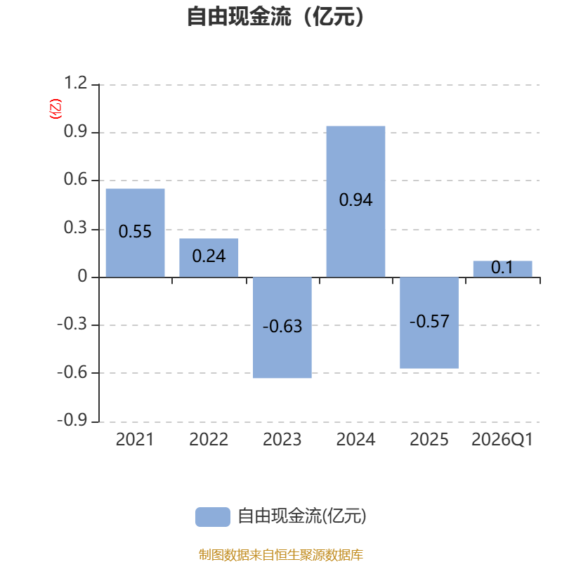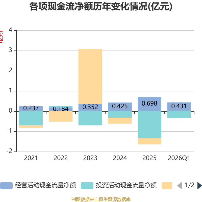 截至2026年一季度末,公司经营活动现金流净额为4314.64万元,同比增长52.52%;筹资活动现金流净额0元,与同期相比基本不变;投资活动现金流净额-3439.4万元,上年同期为-5864.79万元。