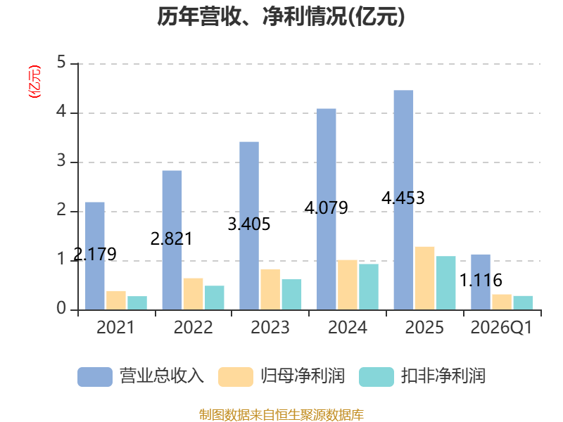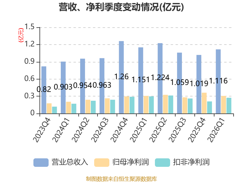 中证智能财讯民士达(920394)4月13日披露2026年第一季度报告。公司实现营业总收入1.12亿元,同比下降3.04%;归母净利润3057.98万元,同比增长0.10%;扣非净利润2744.51万元,同比下降8.02%;经营活动产生的现金流量净额为4314.64万元,同比增长52.52%;报告期内,民士达基本每股收益为0.21元,加权平均净资产收益率为3.69%。