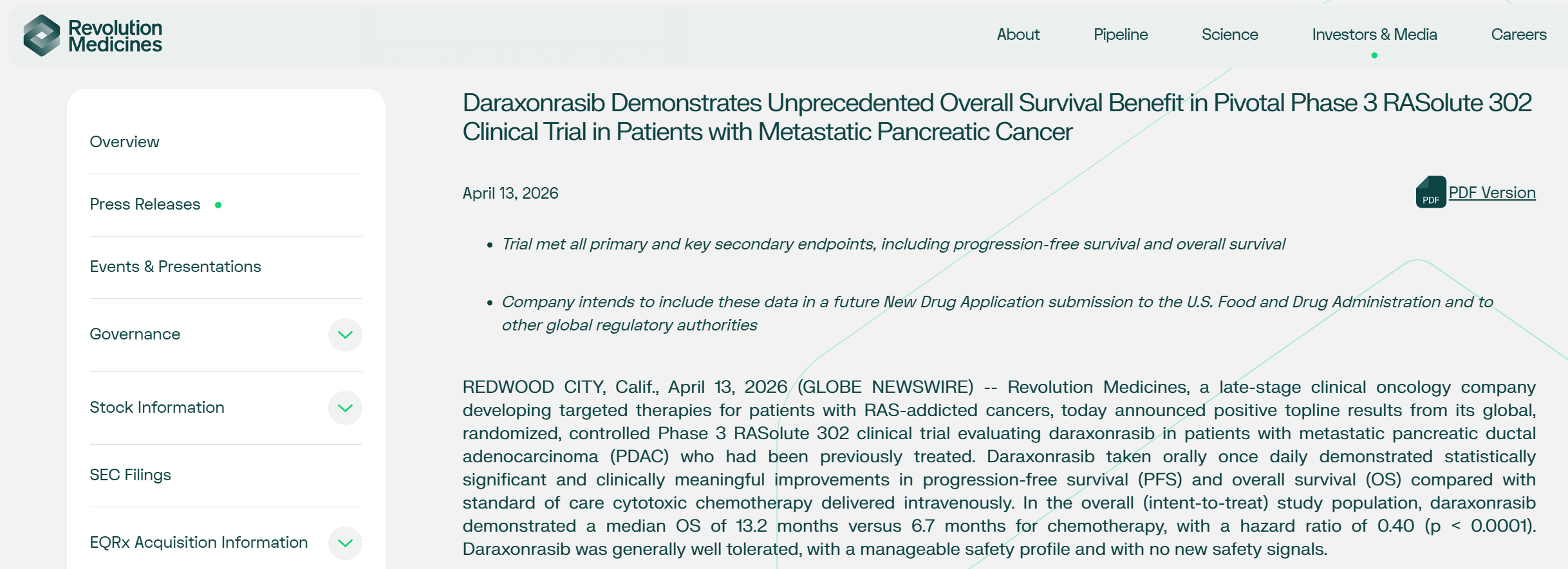 Revolution Medicines表示,该口服药有望为胰腺癌患者带来一种新的治疗选择。胰腺癌是一种高度侵袭性的疾病,在所有主要癌症中五年生存率最低,仅为13%。