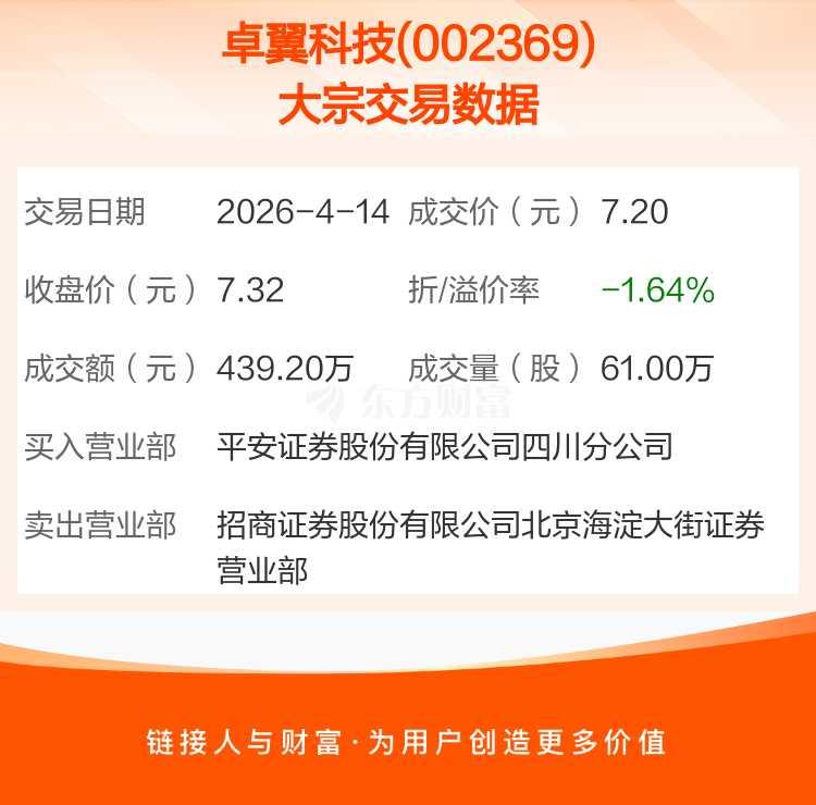 2026年4月14日,卓翼科技发生1笔大宗交易,共成交61.00万股,成交金额439.20万元,占其流通市值比例为0.11%。