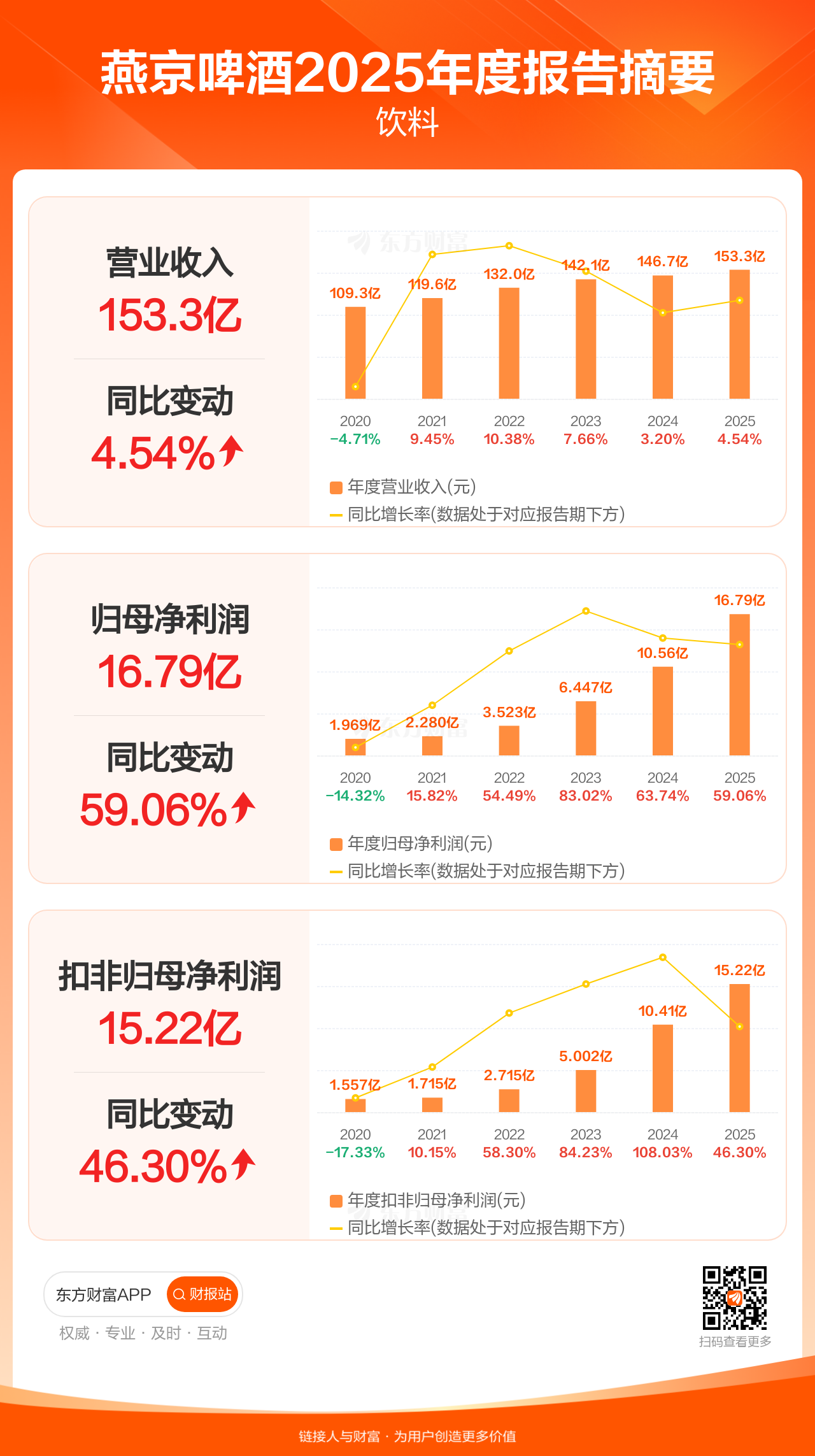燕京啤酒4月15日发布2025年年报显示,公司全年实现营业收入153.33亿元,同比增长4.54%;归母净利润16.79亿元,同比增长59.06%;扣非归母净利润15.22亿元,同比增长46.30%。