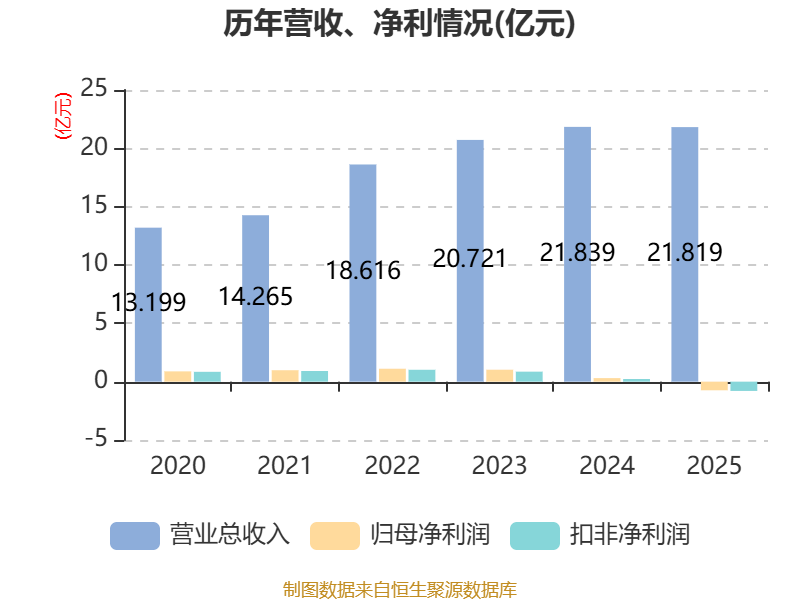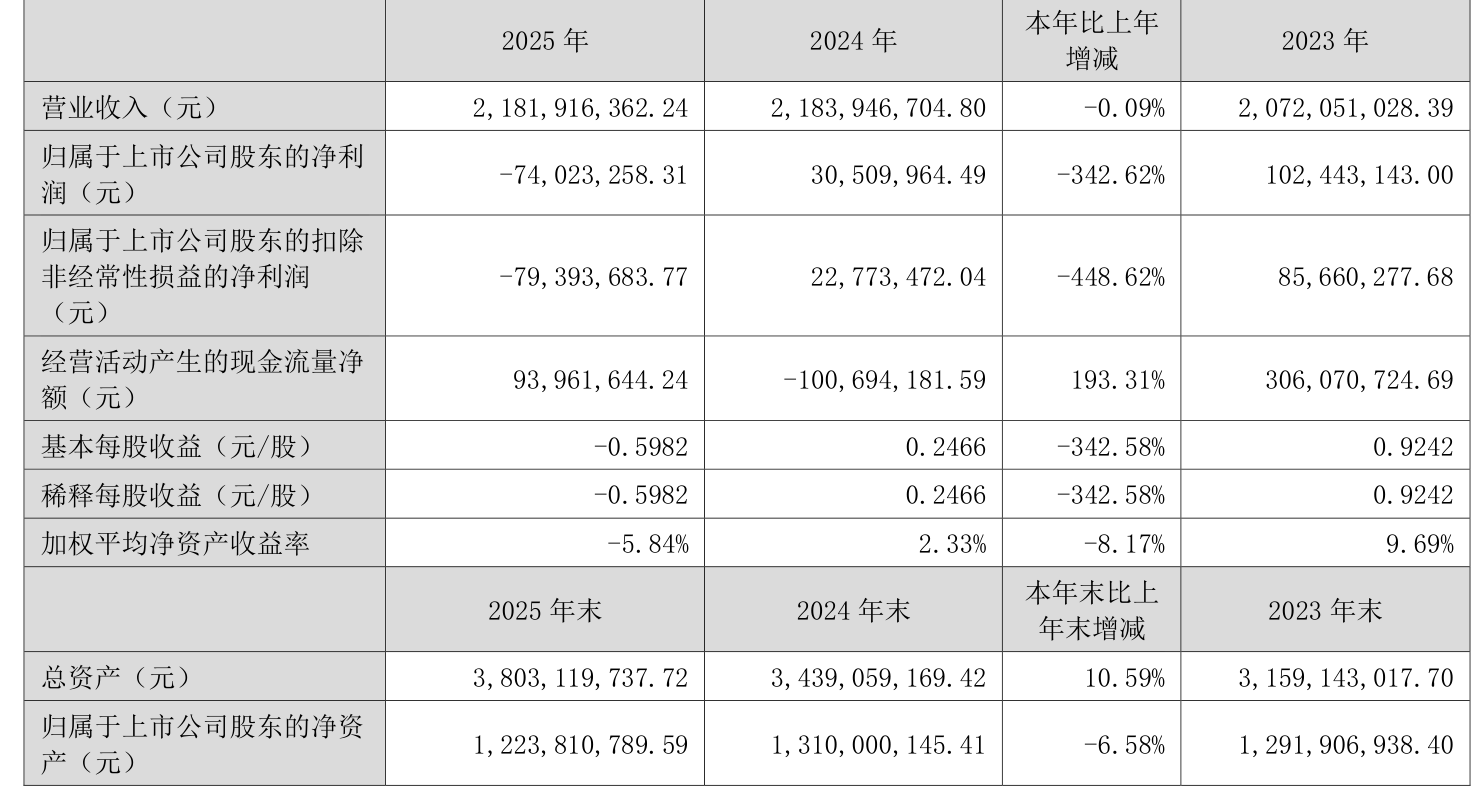 中证智能财讯一彬科技(001278)4月15日披露2025年年度报告。2025年,公司实现营业总收入21.82亿元,同比下降0.09%;归母净利润亏损7402.33万元,上年同期盈利3051万元;扣非净利润亏损7939.37万元,上年同期盈利2277.35万元;经营活动产生的现金流量净额为9396.16万元,上年同期为-1.01亿元;报告期内,一彬科技基本每股收益为-0.5982元,加权平均净资产收益率为-5.84%。