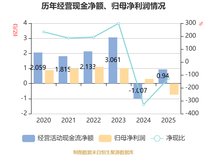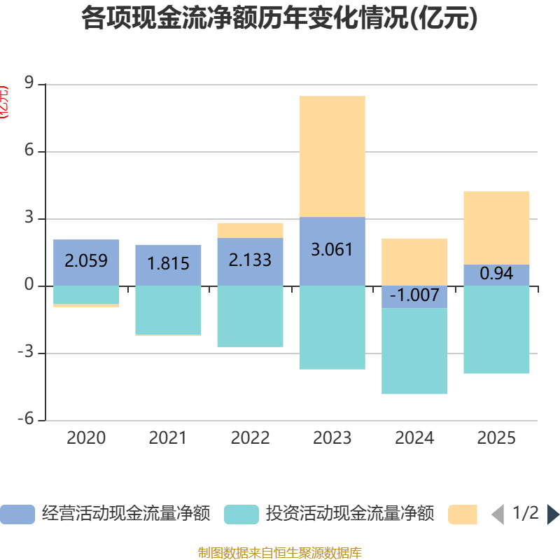 截至2025年,公司经营活动现金流净额为9396.16万元,同比增加1.95亿元;筹资活动现金流净额3.27亿元,同比增加1.17亿元;投资活动现金流净额-3.93亿元,上年同期为-3.83亿元。