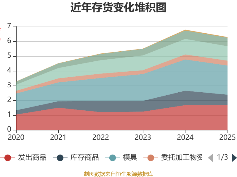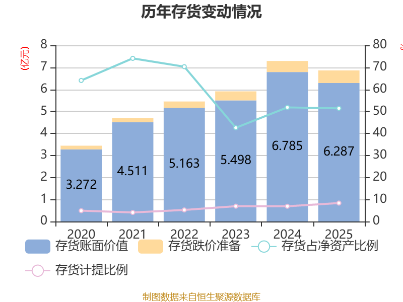 从存货变动来看,截至2025年末,公司存货账面价值为6.29亿元,占净资产的51.38%,较上年末减少4978.57万元。其中,存货跌价准备为5734.7万元,计提比例为8.36%。