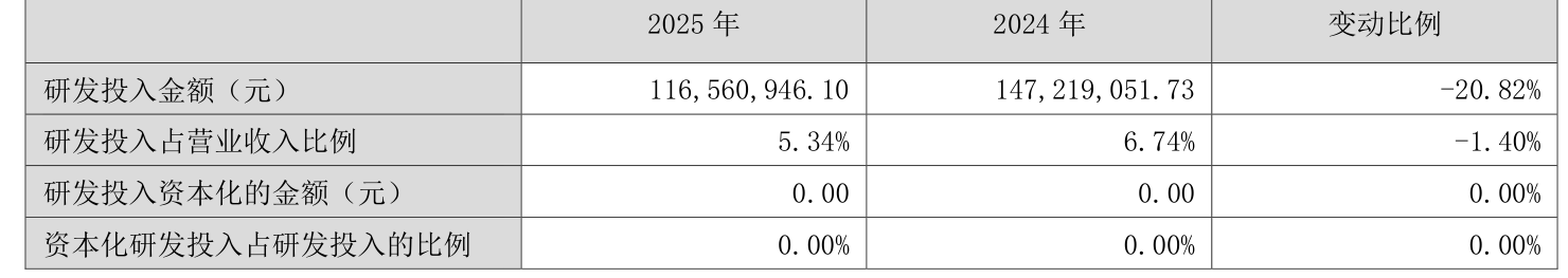 2025年全年,公司研发投入金额为1.17亿元,同比下降20.82%;研发投入占营业收入比例为5.34%,相比上年同期下降1.4个百分点。此外,公司全年研发投入资本化率为0%。