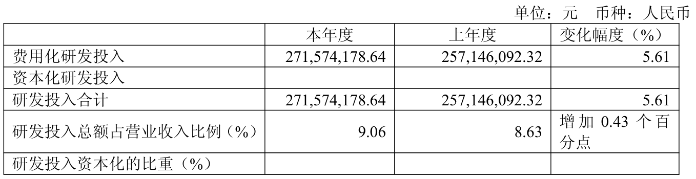 2025年全年,公司研发投入金额为2.72亿元,同比增长5.61%;研发投入占营业收入比例为9.06%,相比上年同期上升0.43个百分点。
