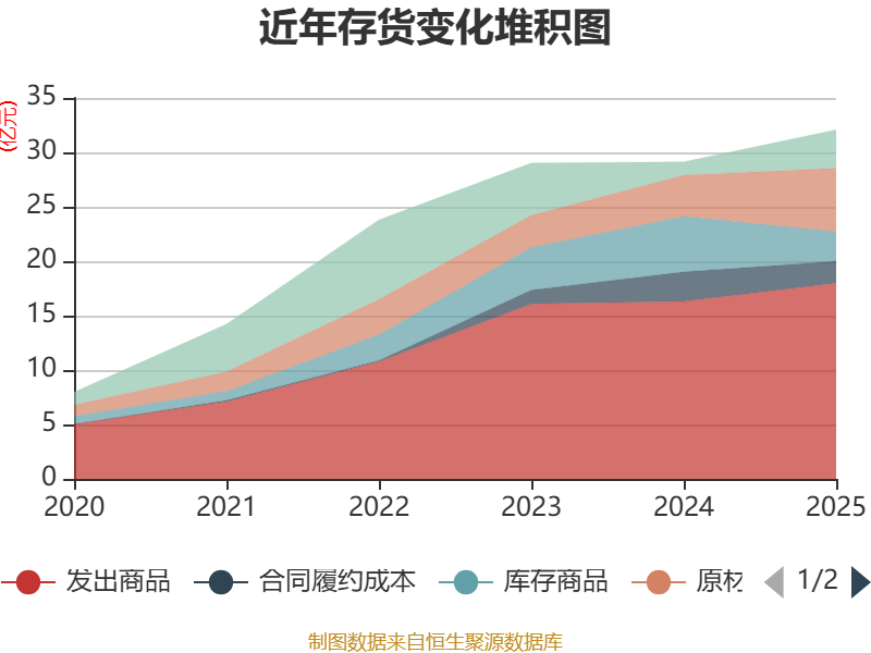 从存货变动来看,截至2025年末,公司存货账面价值为32.08亿元,占净资产的59.49%,较上年末增加2.95亿元。其中,存货跌价准备为1.51亿元,计提比例为4.5%。