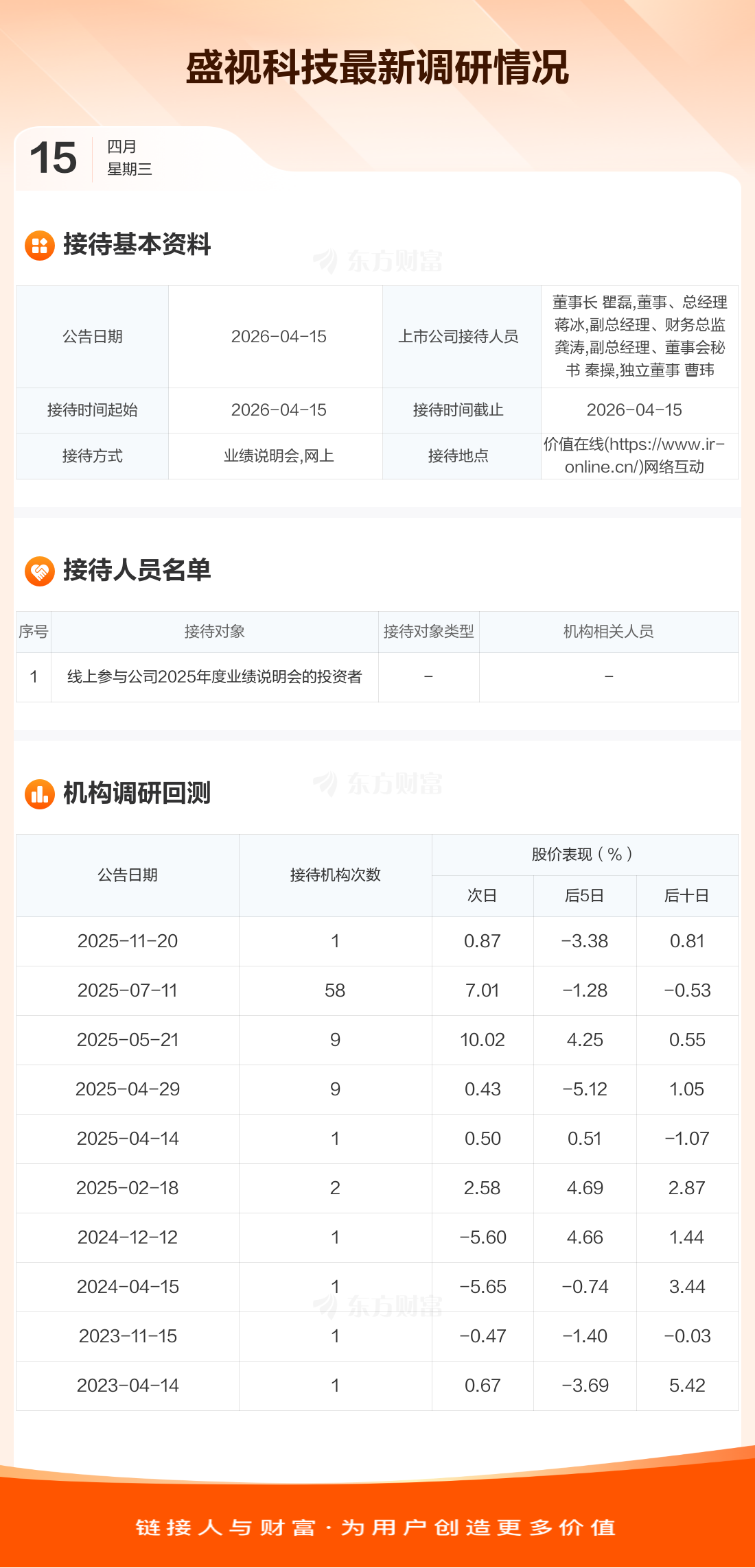 盛视科技4月15日公告称,4月15日接待线上参与公司2025年度业绩说明会的投资者调研。接待人员包括董事长 瞿磊,董事、总经理 蒋冰,副总经理、财务总监 龚涛,副总经理、董事会秘书 秦操,独立董事 曹玮。