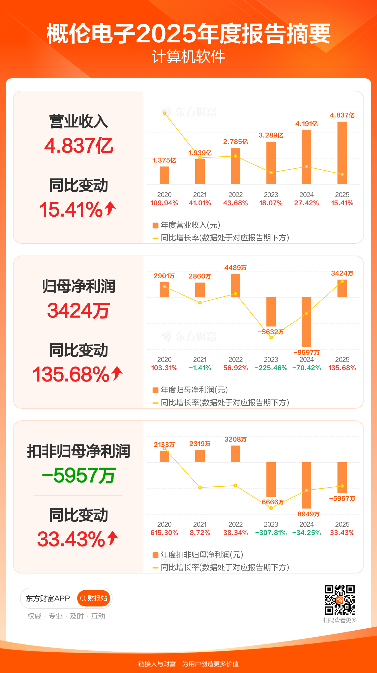 概伦电子4月16日发布2025年年报显示,公司全年实现营业收入4.84亿元,同比增长15.41%;归母净利润3424.32万元,同比增长135.68%;扣非归母净利润-5956.76万元。