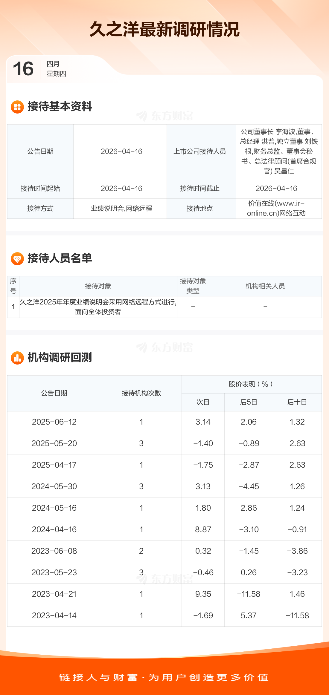 久之洋4月16日公告称,4月16日接待久之洋2025年年度业绩说明会采用网络远程方式进行,面向全体投资者调研。接待人员包括公司董事长 李海波,董事、总经理 洪普,独立董事 刘铁根,财务总监、董事会秘书、总法律顾问(首席合规官) 吴昌仁。