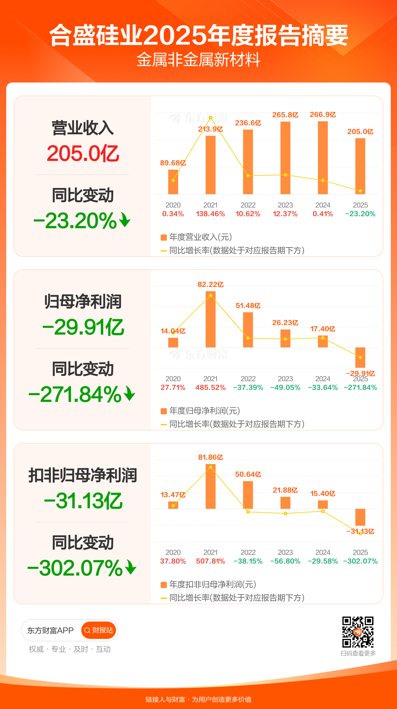 合盛硅业4月17日发布2025年年报显示,公司全年实现营业收入204.99亿元,同比下滑23.20%;归母净利润-29.91亿元;扣非归母净利润-31.13亿元。