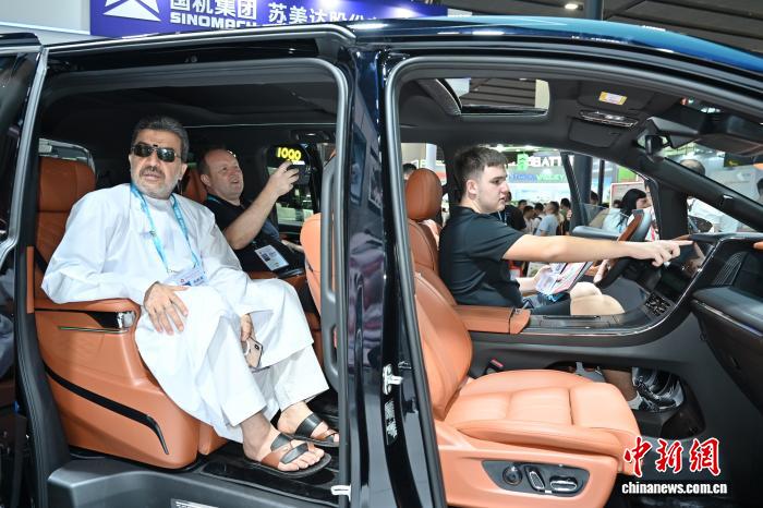 4月16日,境外采购商在广交会展馆体验新能源汽车。中新社记者陈楚红摄