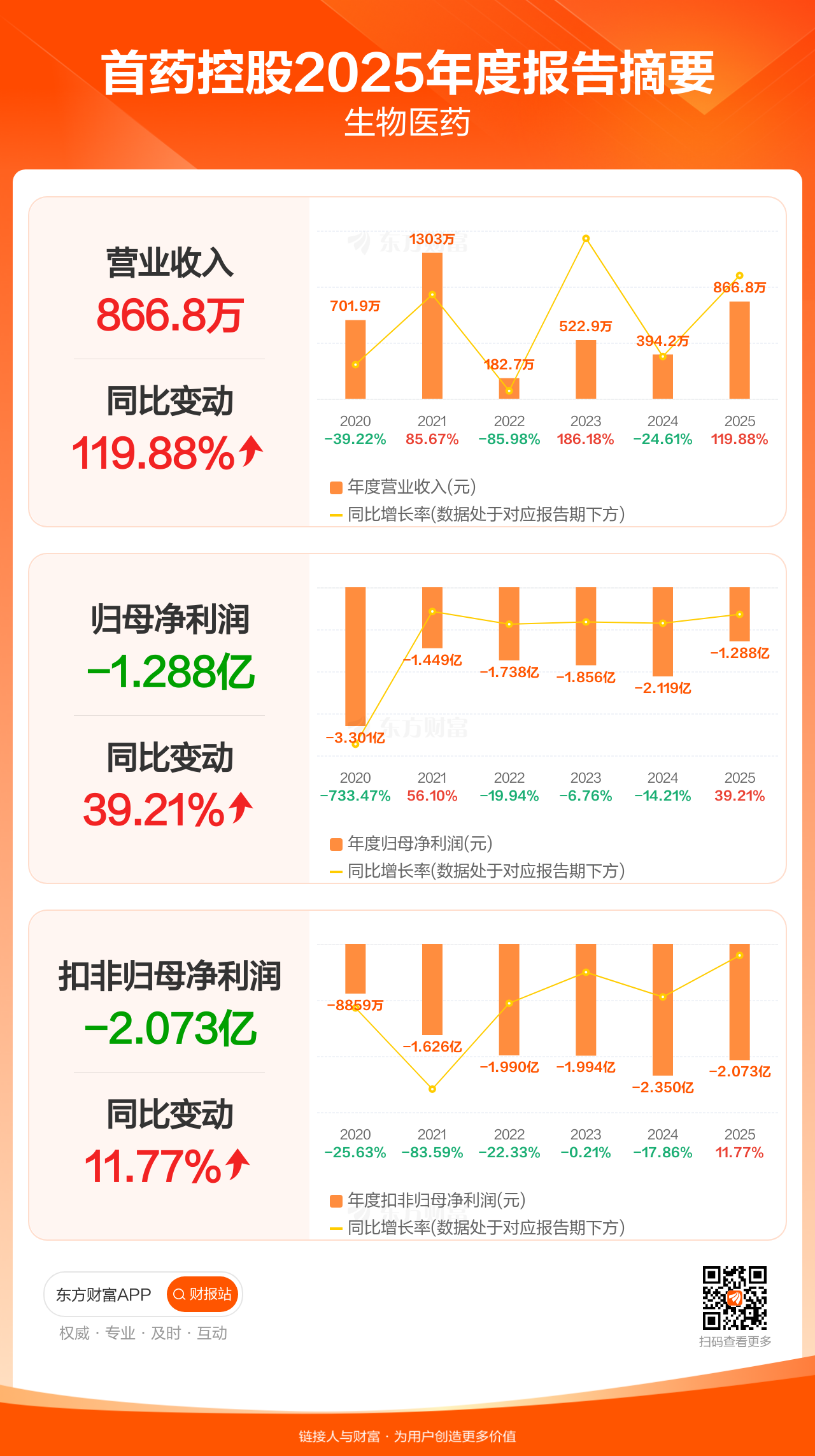 首药控股4月18日发布2025年年报显示,公司全年实现营业收入866.76万元,同比增长119.88%;归母净利润-1.29亿元;扣非归母净利润-2.07亿元。