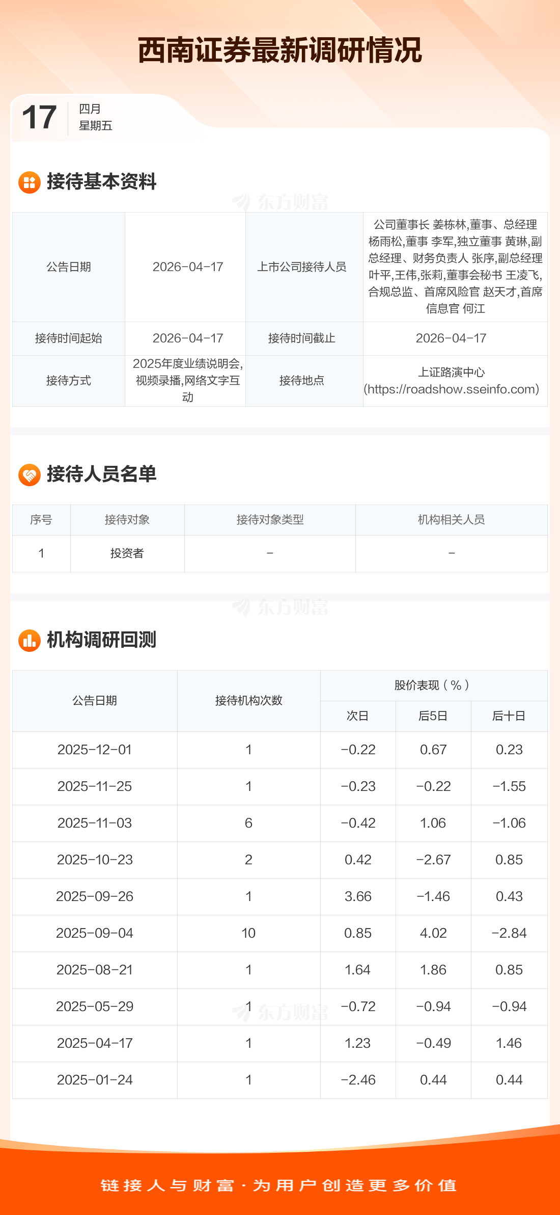 西南证券4月17日公告称,4月17日接待投资者调研。接待人员包括公司董事长 姜栋林,董事、总经理 杨雨松,董事 李军,独立董事 黄琳,副总经理、财务负责人 张序,副总经理 叶平,王伟,张莉,董事会秘书 王凌飞,合规总监、首席风险官 赵天才,首席信息官 何江。