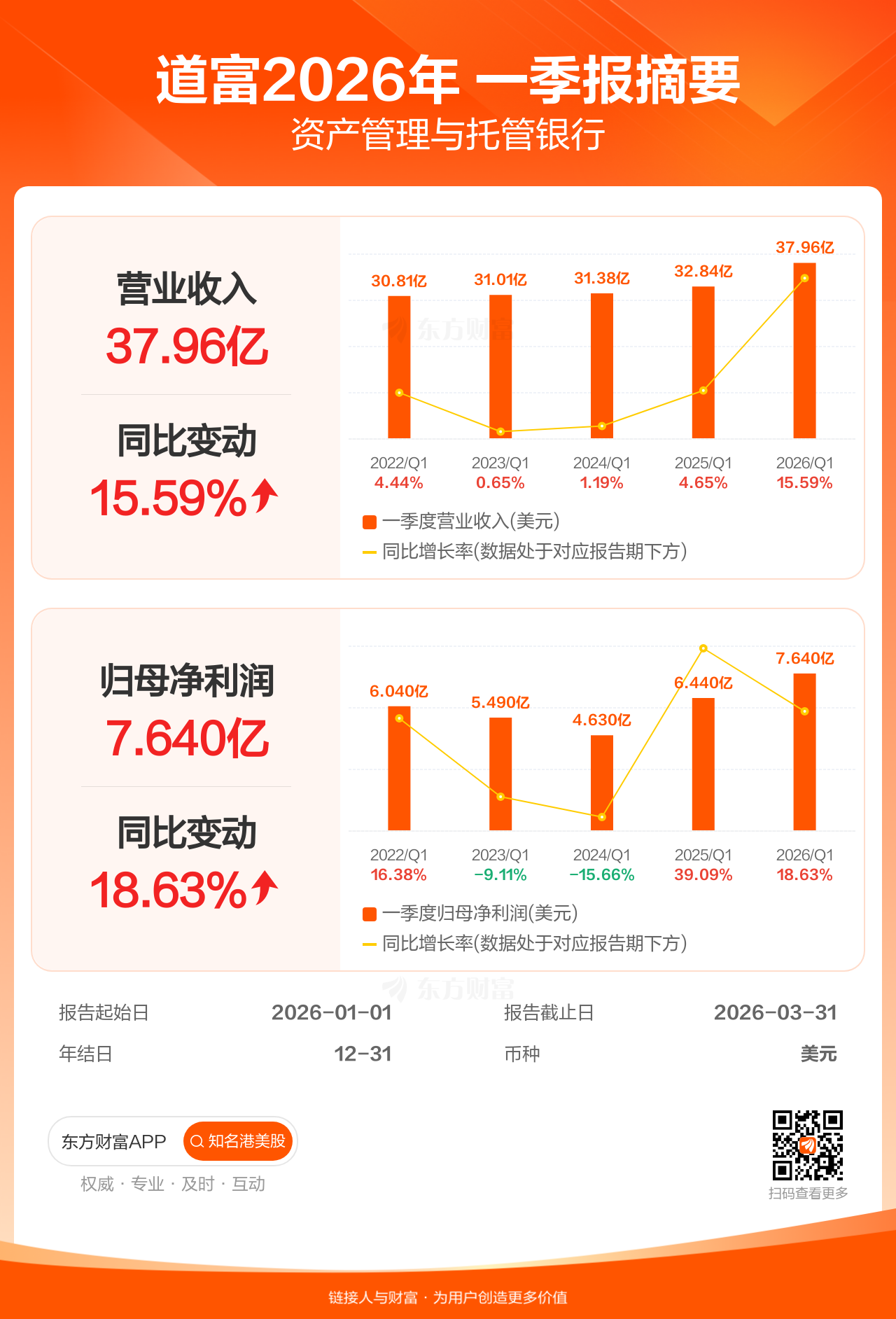 道富4月17日发布一季报业绩,截至2026年3月31日的3个月内,该公司营业收入37.96亿美元,同比增长15.59%;公司权益持有人应占溢利(归母净利润)7.64亿美元,同比增长18.63%。