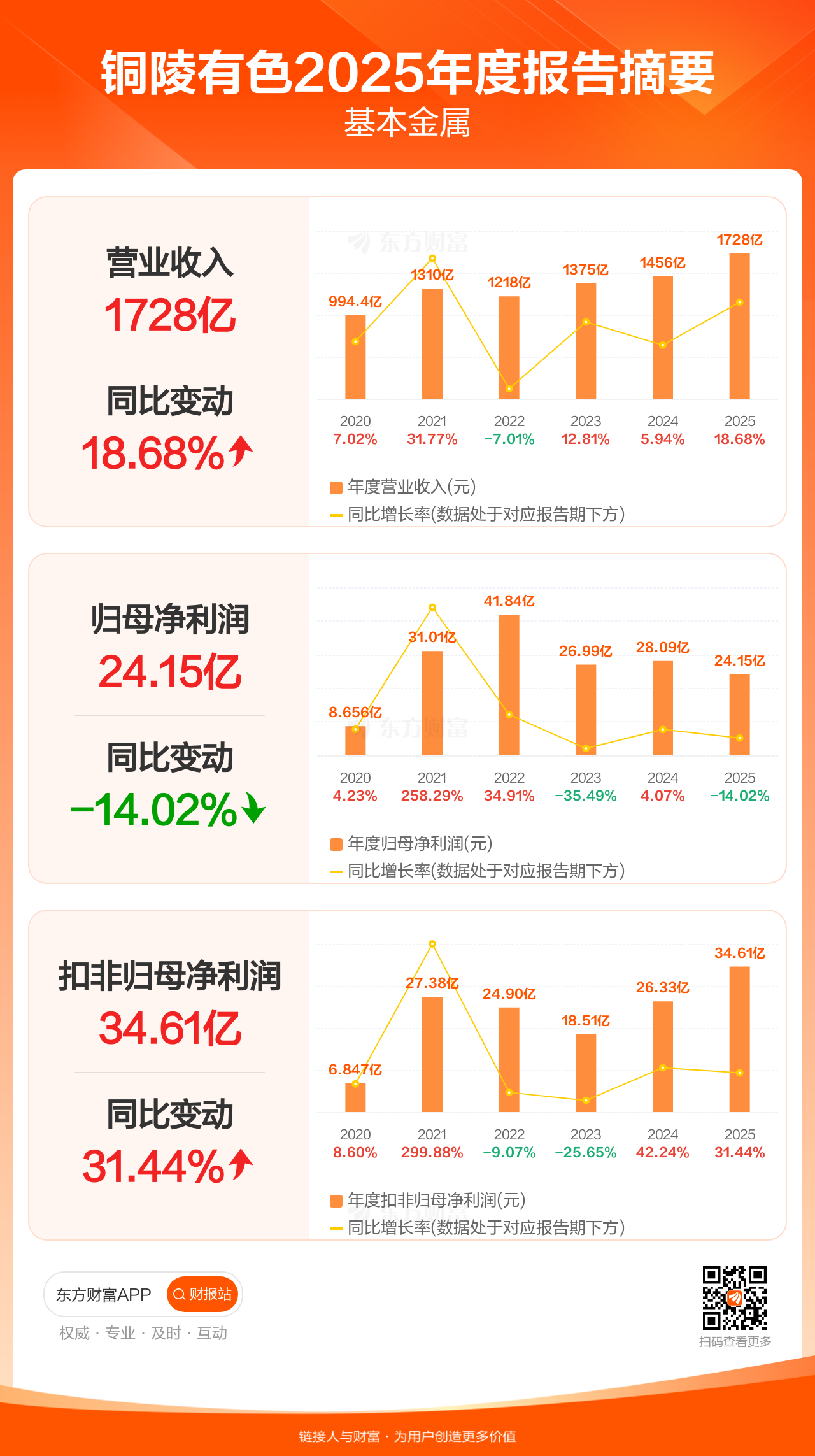 铜陵有色4月20日发布2025年年报显示,公司全年实现营业收入1728.25亿元,同比增长18.68%;归母净利润24.15亿元,同比下滑14.02%;扣非归母净利润34.61亿元,同比增长31.44%。