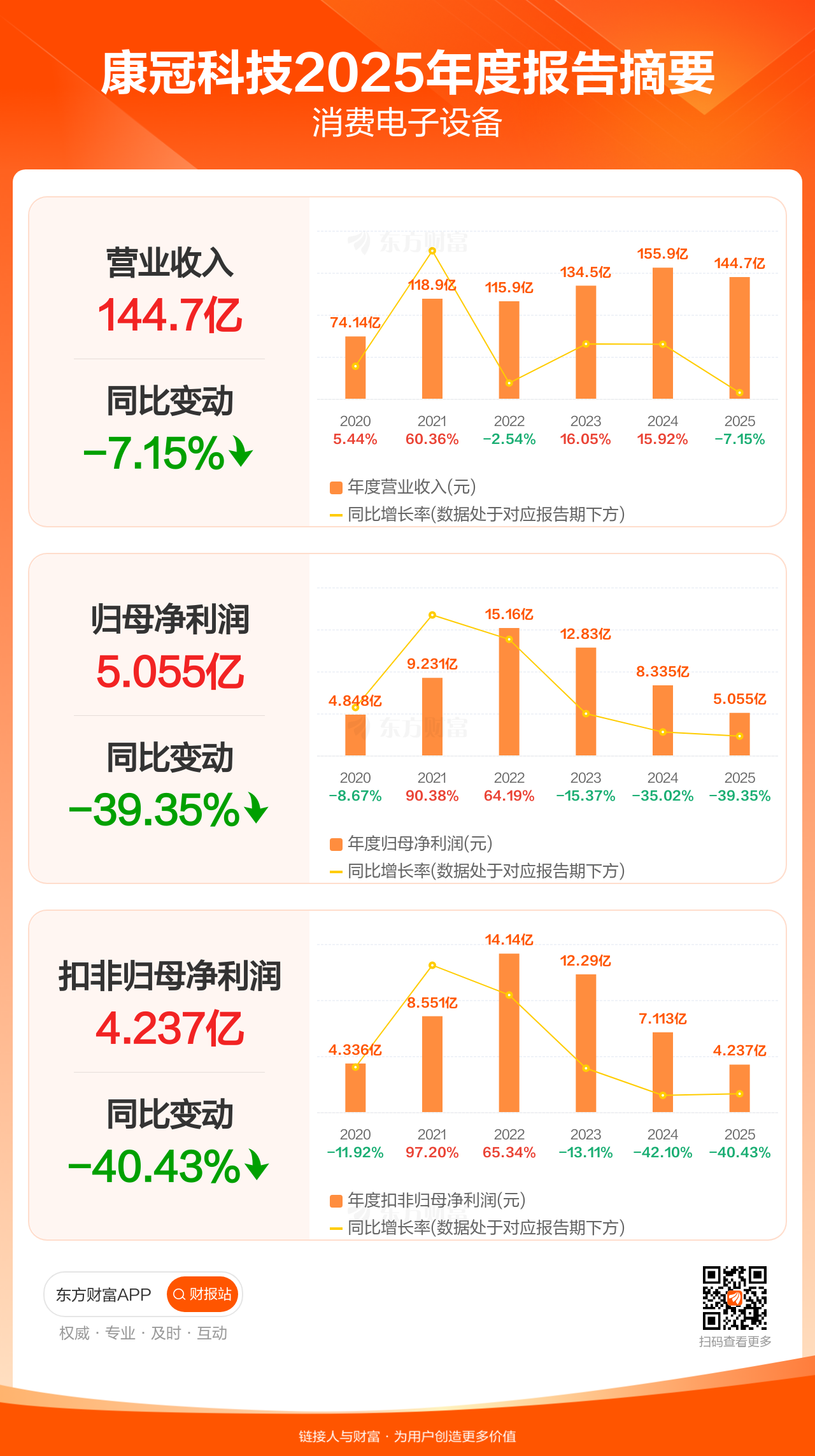 康冠科技4月20日发布2025年年报显示,公司全年实现营业收入144.73亿元,同比下滑7.15%;归母净利润5.05亿元,同比下滑39.35%;扣非归母净利润4.24亿元,同比下滑40.43%。