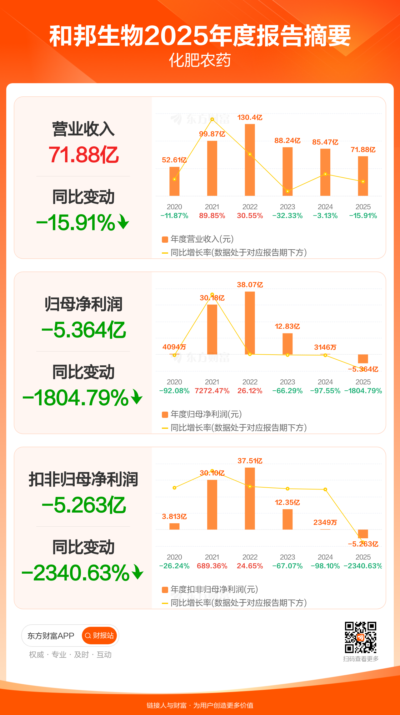 和邦生物4月21日发布2025年年报显示,公司全年实现营业收入71.88亿元,同比下滑15.91%;归母净利润-5.36亿元;扣非归母净利润-5.26亿元。