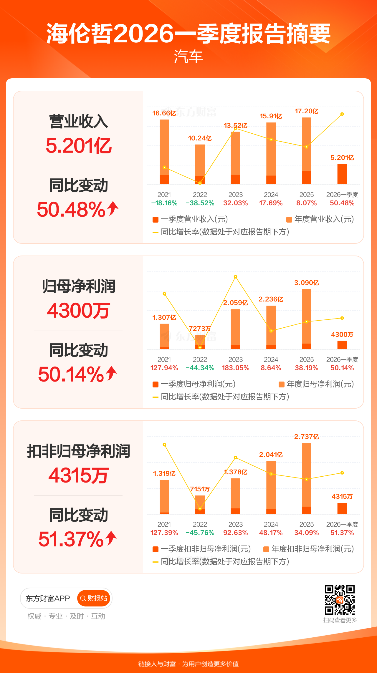 海伦哲4月21日发布2026年一季报显示,公司一季度实现营业收入5.20亿元,同比增长50.48%;归母净利润4299.91万元,同比增长50.14%;扣非归母净利润4314.78万元,同比增长51.37%。