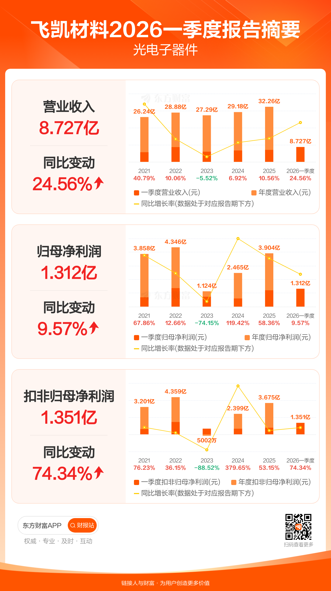 飞凯材料4月22日发布2026年一季报显示,公司一季度实现营业收入8.73亿元,同比增长24.56%;归母净利润1.31亿元,同比增长9.57%;扣非归母净利润1.35亿元,同比增长74.34%。