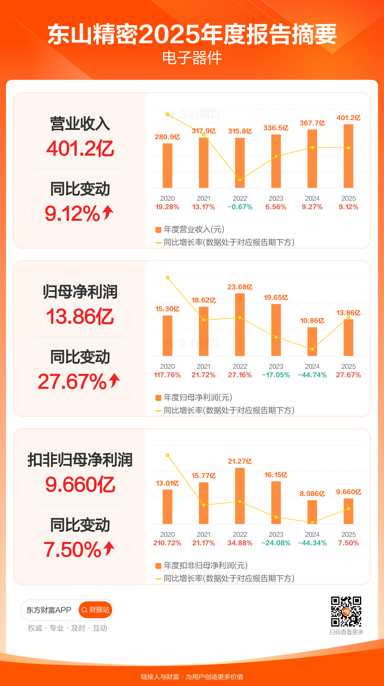 东山精密4月22日发布2025年年报显示,公司全年实现营业收入401.25亿元,同比增长9.12%;归母净利润13.86亿元,同比增长27.67%;扣非归母净利润9.66亿元,同比增长7.50%。