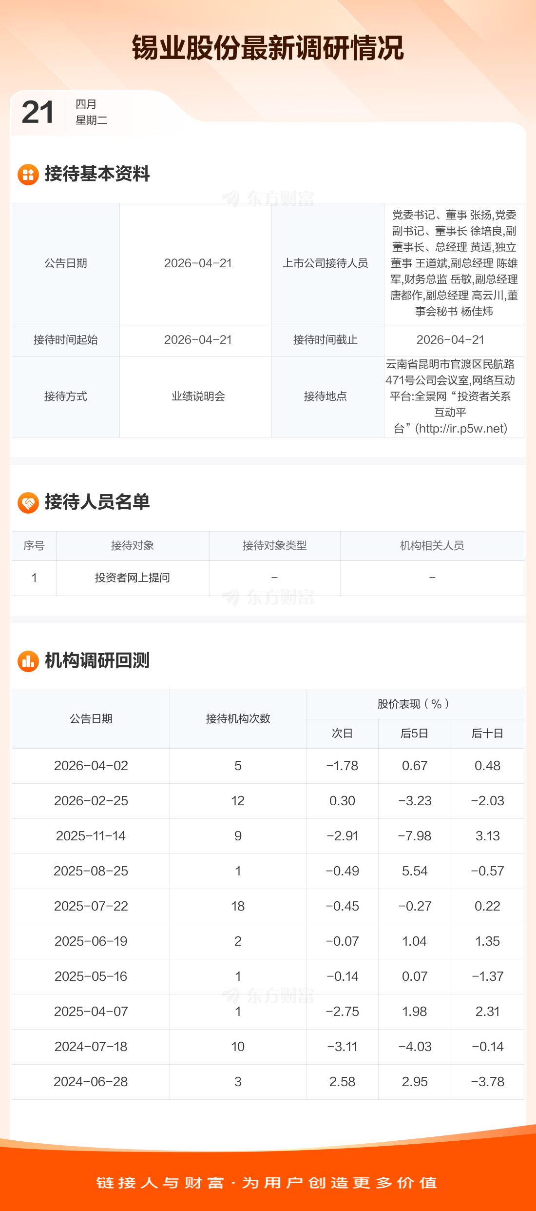 锡业股份4月21日公告称,4月21日接待投资者网上提问调研。接待人员包括党委书记、董事 张扬,党委副书记、董事长 徐培良,副董事长、总经理 黄适,独立董事 王道斌,副总经理 陈雄军,财务总监 岳敏,副总经理 唐都作,副总经理 高云川,董事会秘书 杨佳炜。
