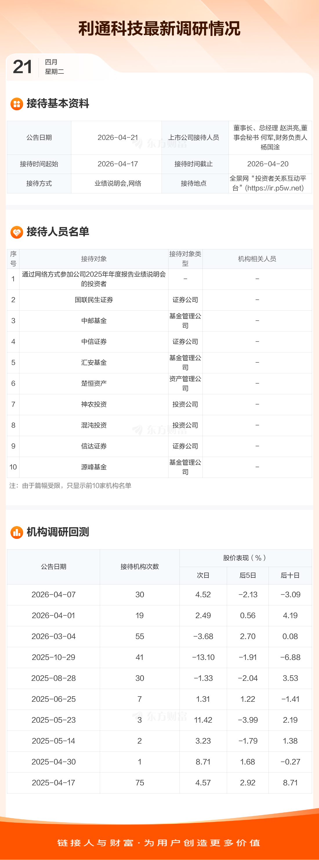 利通科技4月21日公告称,4月17日至4月20日接待通过网络方式参加公司2025年年度报告业绩说明会的投资者等28家机构调研。接待人员包括董事长、总经理 赵洪亮,董事会秘书 何军,财务负责人 杨国淦。
