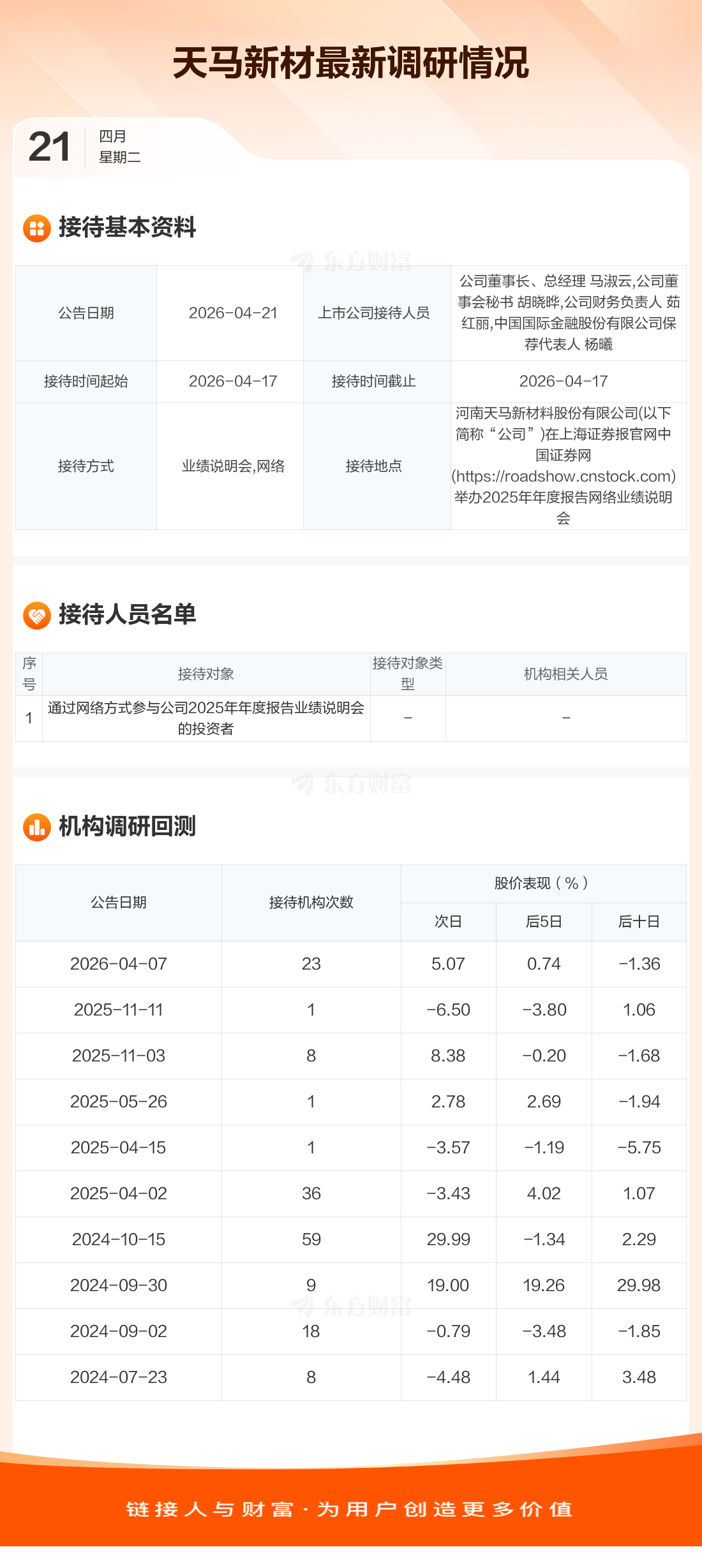 天马新材4月21日公告称,4月17日接待通过网络方式参与公司2025年年度报告业绩说明会的投资者调研。接待人员包括公司董事长、总经理 马淑云,公司董事会秘书 胡晓晔,公司财务负责人 茹红丽,中国国际金融股份有限公司保荐代表人 杨曦。