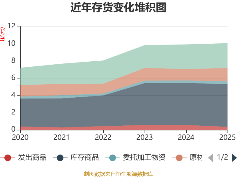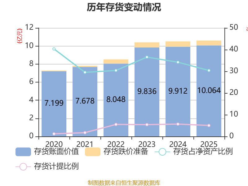 从存货变动来看,截至2025年末,公司存货账面价值为10.06亿元,占净资产的30.38%,较上年末增加1511.41万元。其中,存货跌价准备为5340.95万元,计提比例为5.04%。