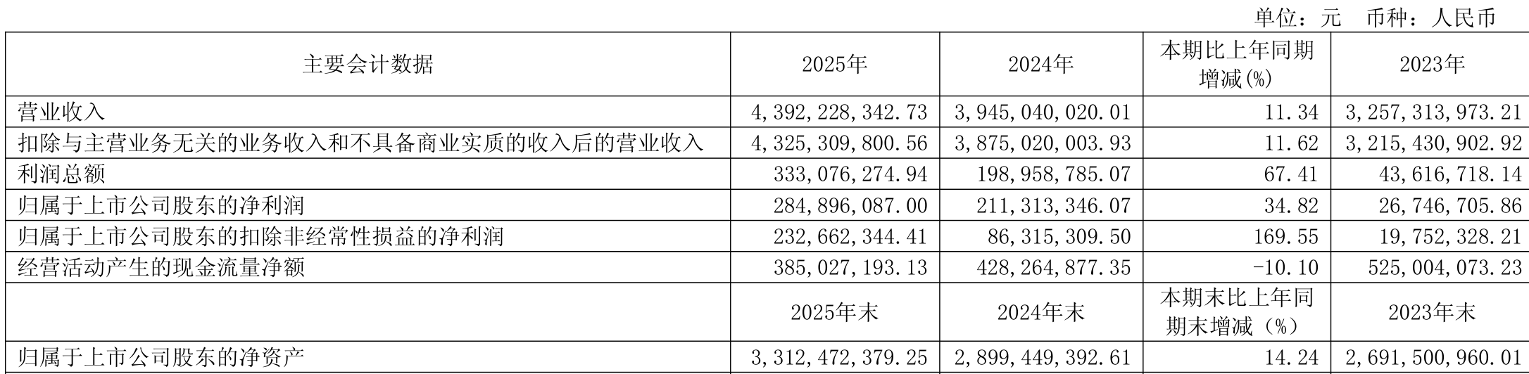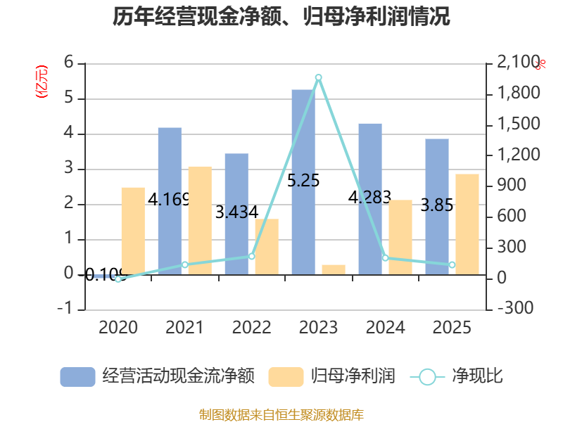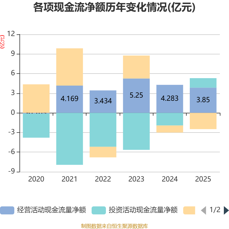 截至2025年,公司经营活动现金流净额为3.85亿元,同比下降10.1%;筹资活动现金流净额-2.49亿元,同比减少1.41亿元;投资活动现金流净额1.46亿元,上年同期为-1.93亿元。