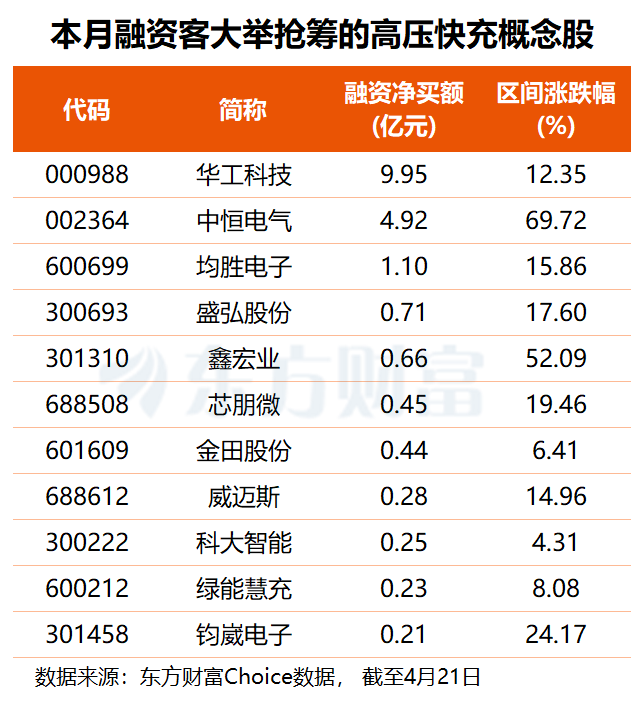 从资金角度看,东方财富Choice数据显示,本月共有17只高压快充概念股获得融资净买入,华工科技获融资客大举抢筹9.95亿元,中恒电气获杠杆资金加仓4.92亿元,均胜电子融资净买额达1.10亿元,盛弘股份、鑫宏业亦获约0.7亿元融资净买入。