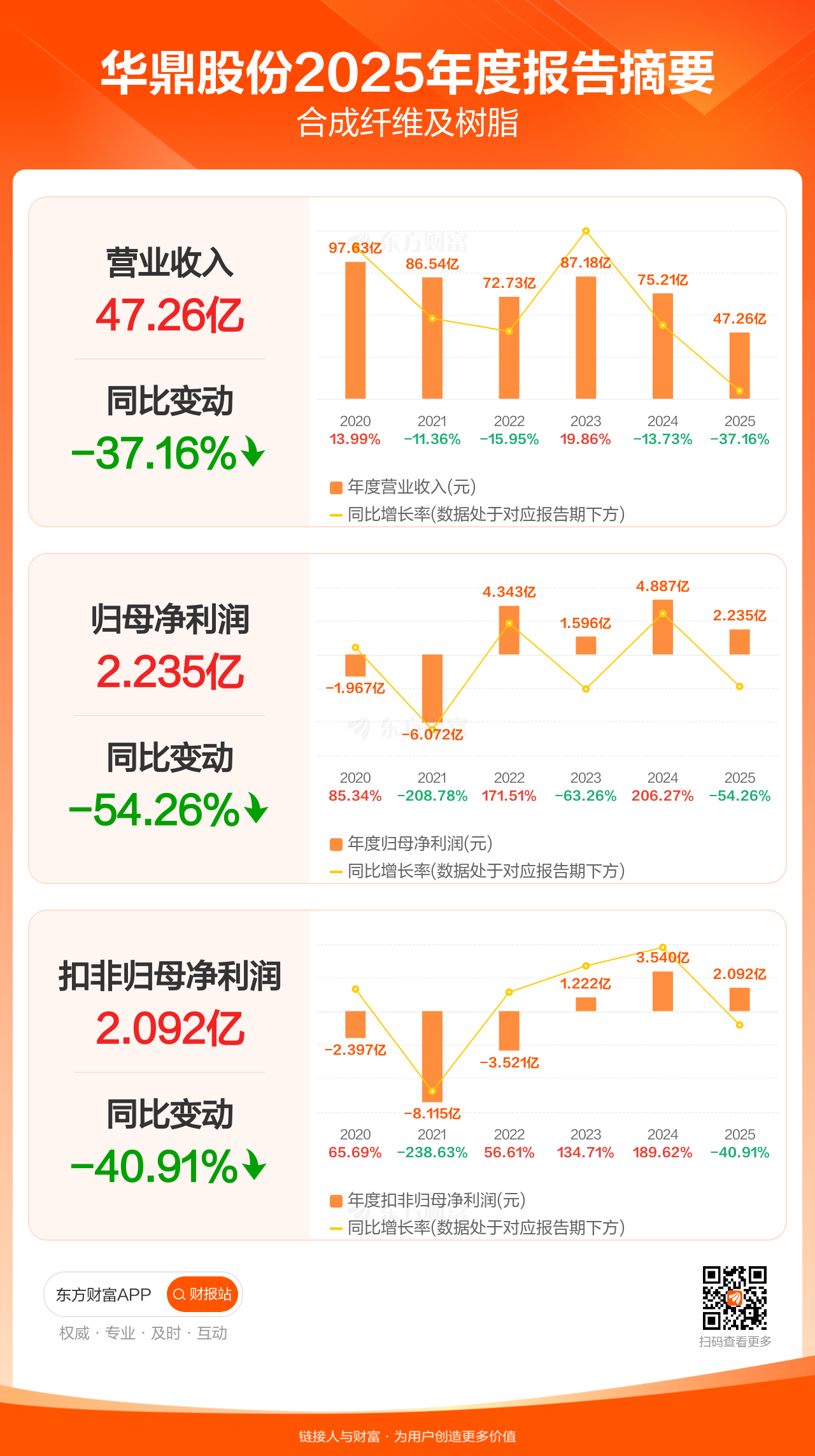 华鼎股份4月23日发布2025年年报显示,公司全年实现营业收入47.26亿元,同比下滑37.16%;归母净利润2.24亿元,同比下滑54.26%;扣非归母净利润2.09亿元,同比下滑40.91%。