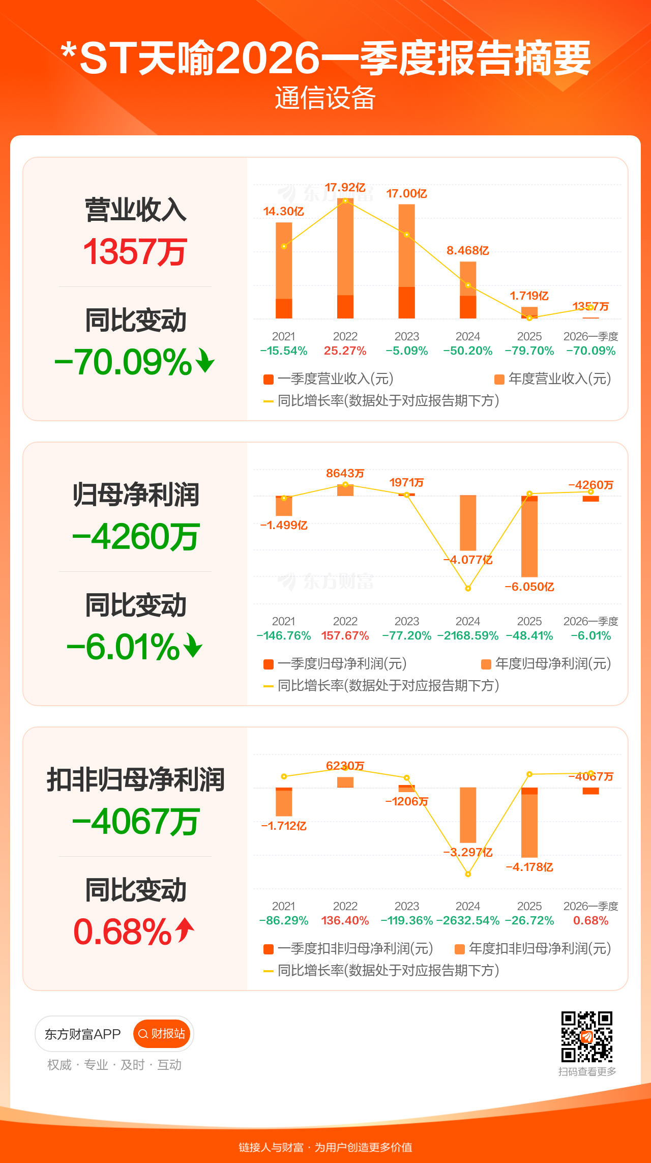 *ST天喻4月23日发布2026年一季报显示,公司一季度实现营业收入1357.06万元,同比下滑70.09%;归母净利润-4260.43万元;扣非归母净利润-4066.89万元。