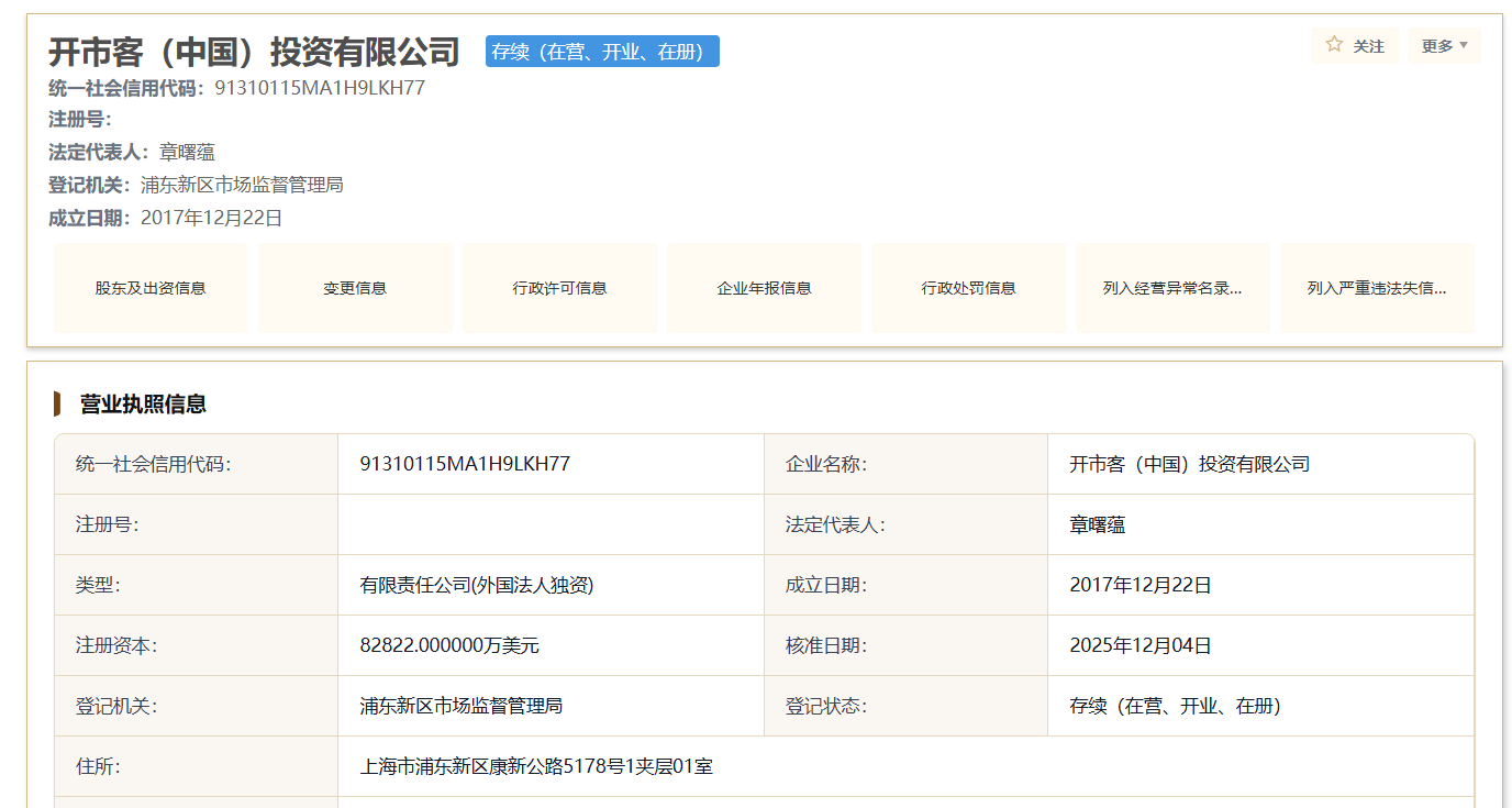 从两家公司登记信息看,国家企业信用信息公示系统显示,开市客(北京)国际商业发展有限公司成立于2026年4月16日,法定代表人为黄寿苏,经营范围包括日用百货销售、家用电器销售等。而开市客(中国)投资有限公司则成立于2017年12月22日,法人为章曙蕴。