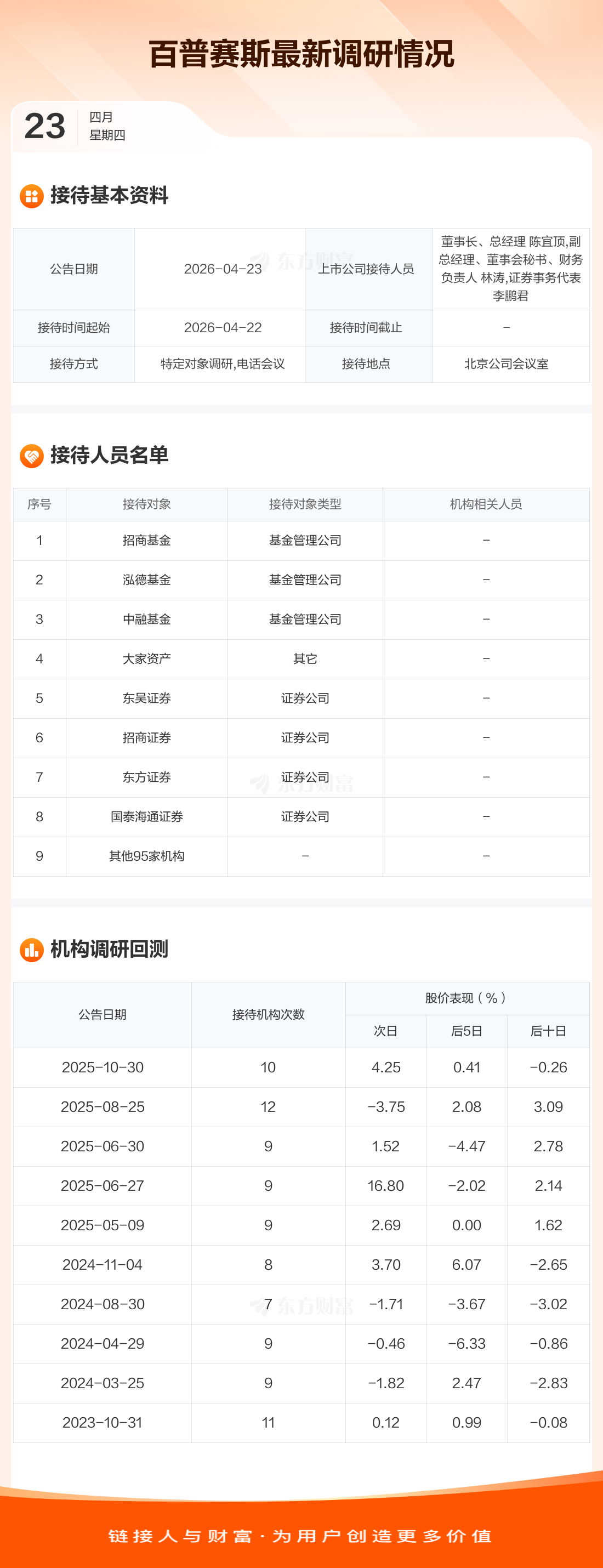 百普赛斯4月23日公告称,4月22日接待招商基金等9家机构调研。接待人员包括董事长、总经理 陈宜顶,副总经理、董事会秘书、财务负责人 林涛,证券事务代表 李鹏君。