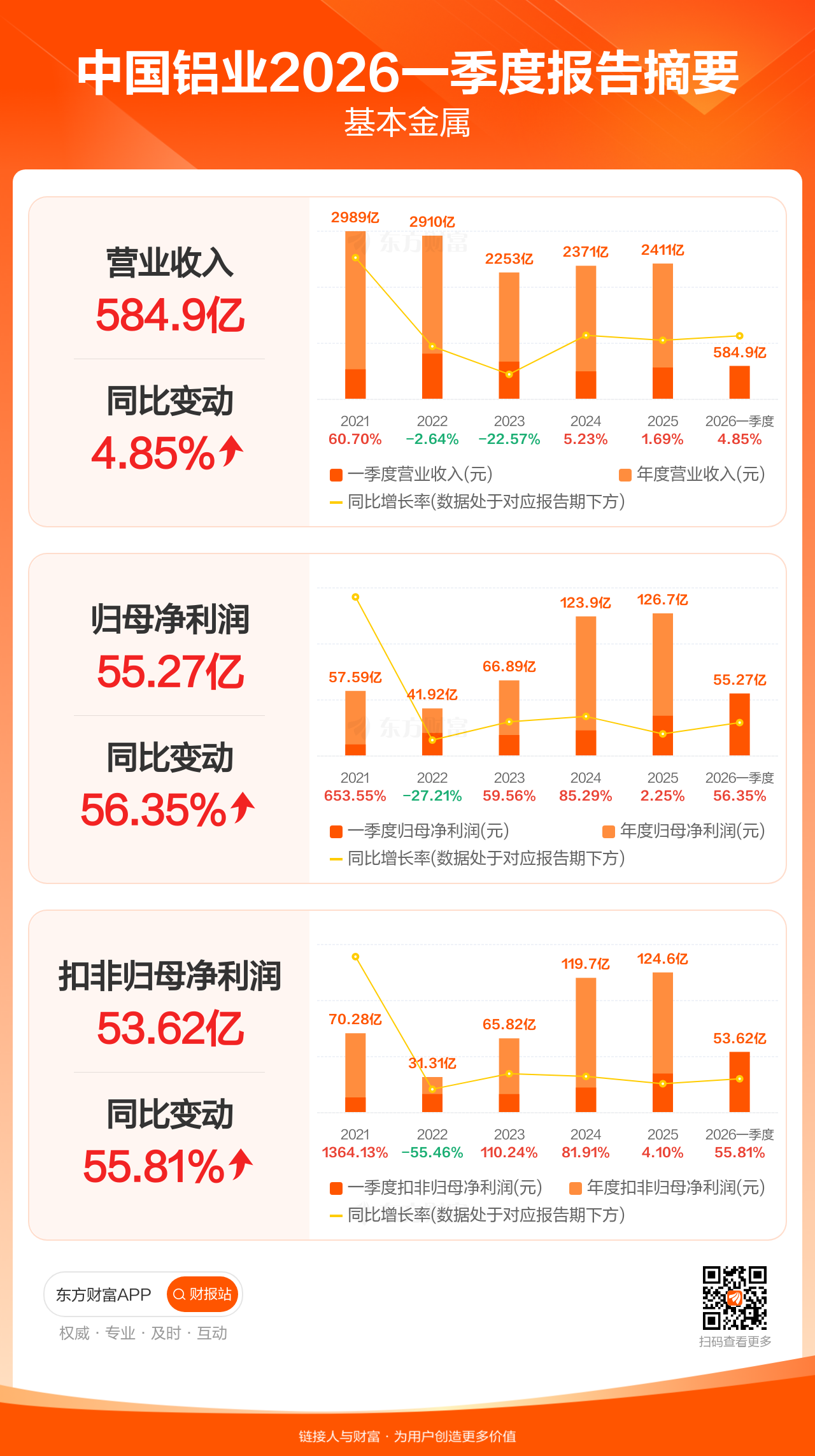 中国铝业4月24日发布2026年一季报显示,公司一季度实现营业收入584.94亿元,同比增长4.85%;归母净利润55.27亿元,同比增长56.35%;扣非归母净利润53.62亿元,同比增长55.81%。