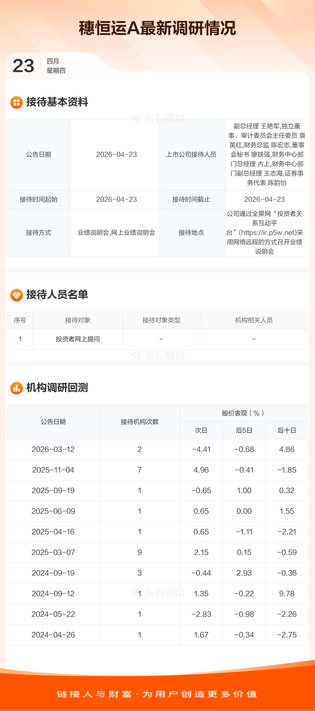 穗恒运A4月23日公告称,4月23日接待投资者网上提问调研。接待人员包括副总经理 王艳军,独立董事、审计委员会主任委员 袁英红,财务总监 陈宏志,董事会秘书 廖铁强,财务中心部门总经理 古上,财务中心部门副总经理 王志海,证券事务代表 陈韵怡。