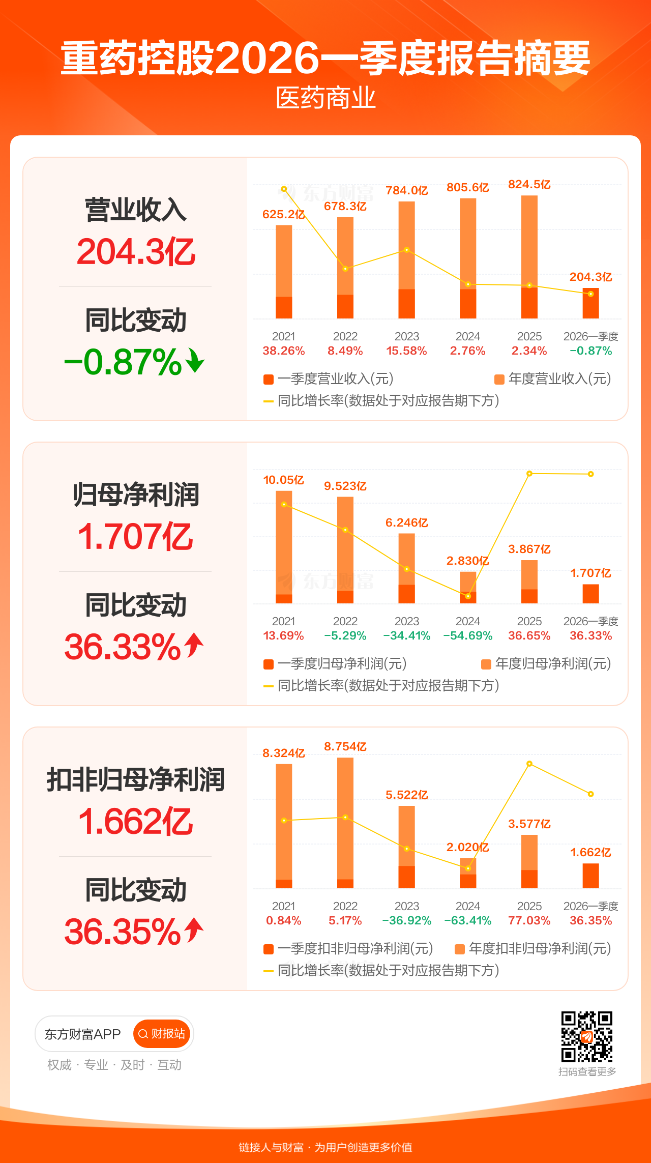 重药控股4月24日发布2026年一季报显示,公司一季度实现营业收入204.32亿元,同比下滑0.87%;归母净利润1.71亿元,同比增长36.33%;扣非归母净利润1.66亿元,同比增长36.35%。