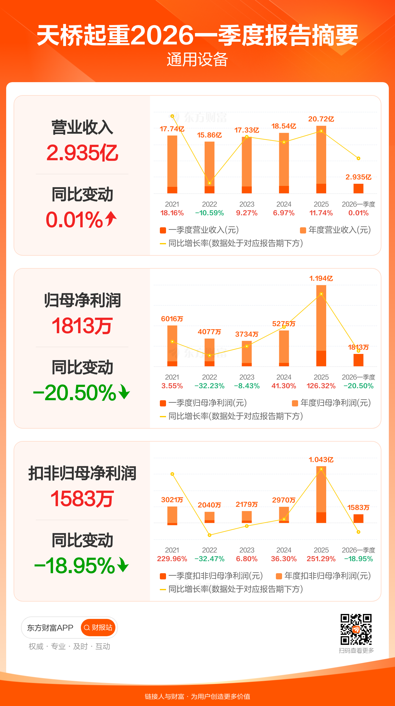 天桥起重4月24日发布2026年一季报显示,公司一季度实现营业收入2.94亿元,同比增长0.01%;归母净利润1813.01万元,同比下滑20.50%;扣非归母净利润1583.35万元,同比下滑18.95%。